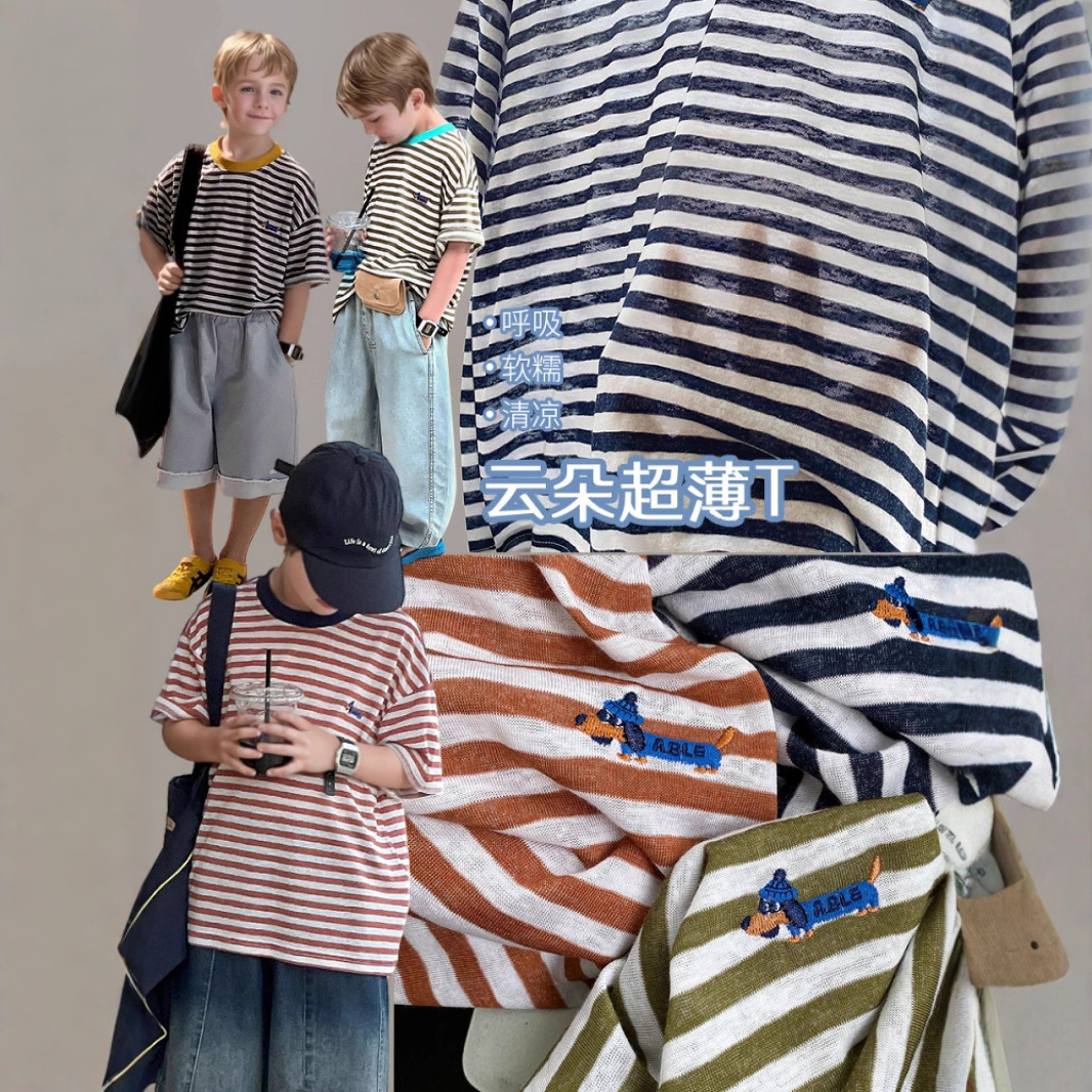 涼しげな子供服の夏服の男の子のストライプの半袖の子供の薄いタイプの半袖のtシャツ2025新型の快適な通気性の上着