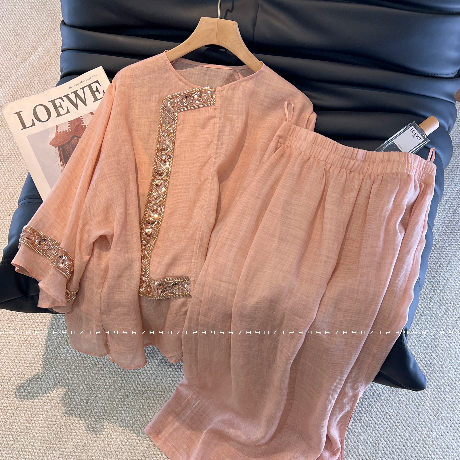 新中国式国風ベルベット厚手広脚ズボン女2024秋冬新作ジャカード流蘇ゆるいカジュアルストレートパンツ