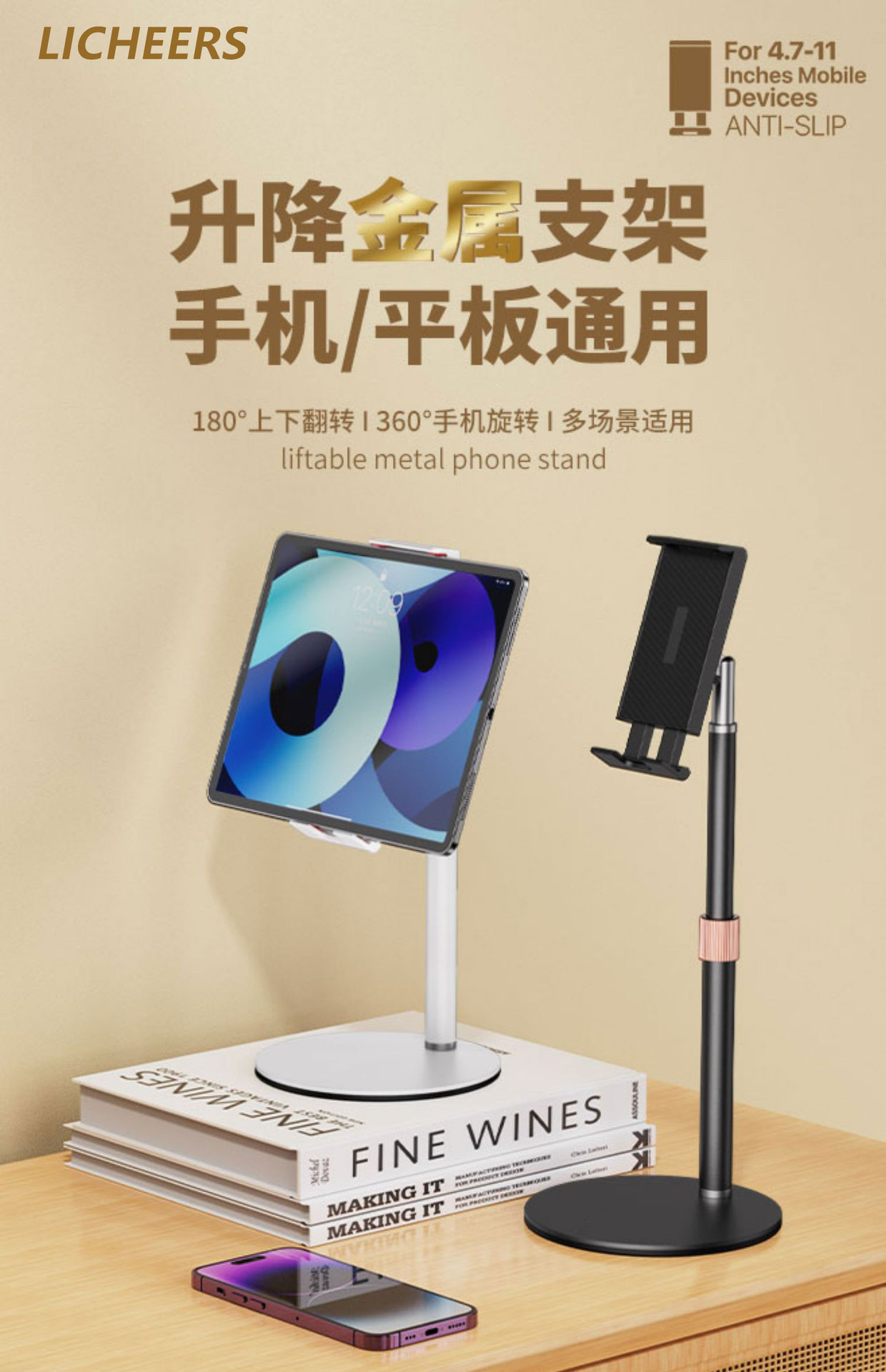 金属携帯電話中継スタンド専用適用ipadタブレット昇降可能伸縮怠け者デスクトップスタンド卸売り
