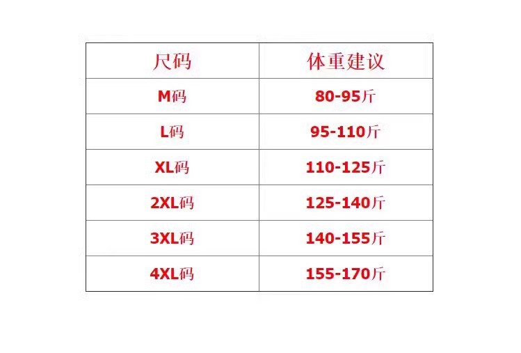 M 推奨体重 40-45kg,L 推奨体重 47.5-55kg,XL 推奨体重 55-62.5kg,2XL 推奨体重 62.5-70kg,3XL 推奨体重 70-77.5kg,4XL 推奨体重 77.5-85kg