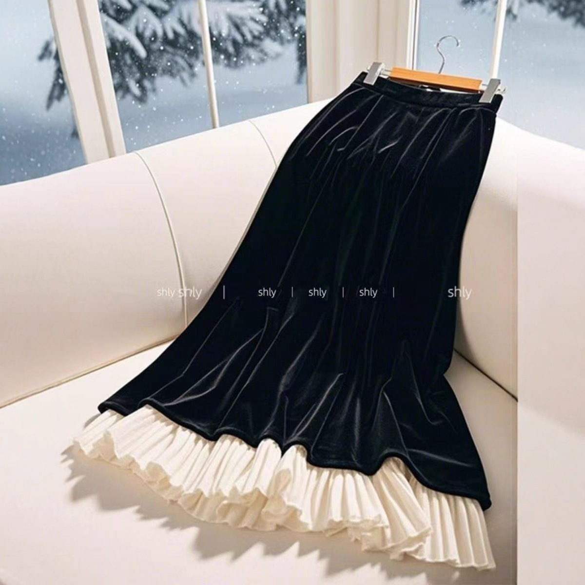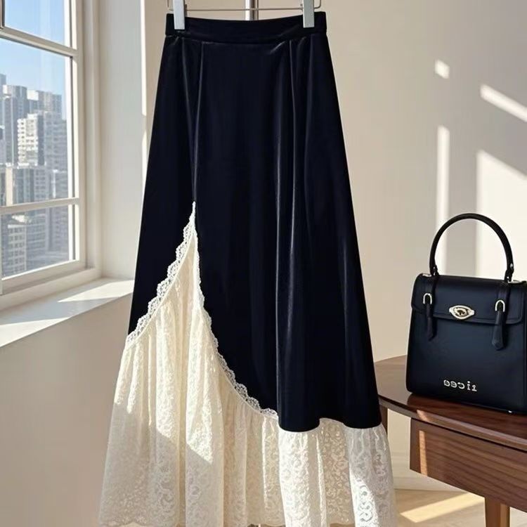 7今年流行超好看黑色拼接丝绒长款半身裙女2025新款秋