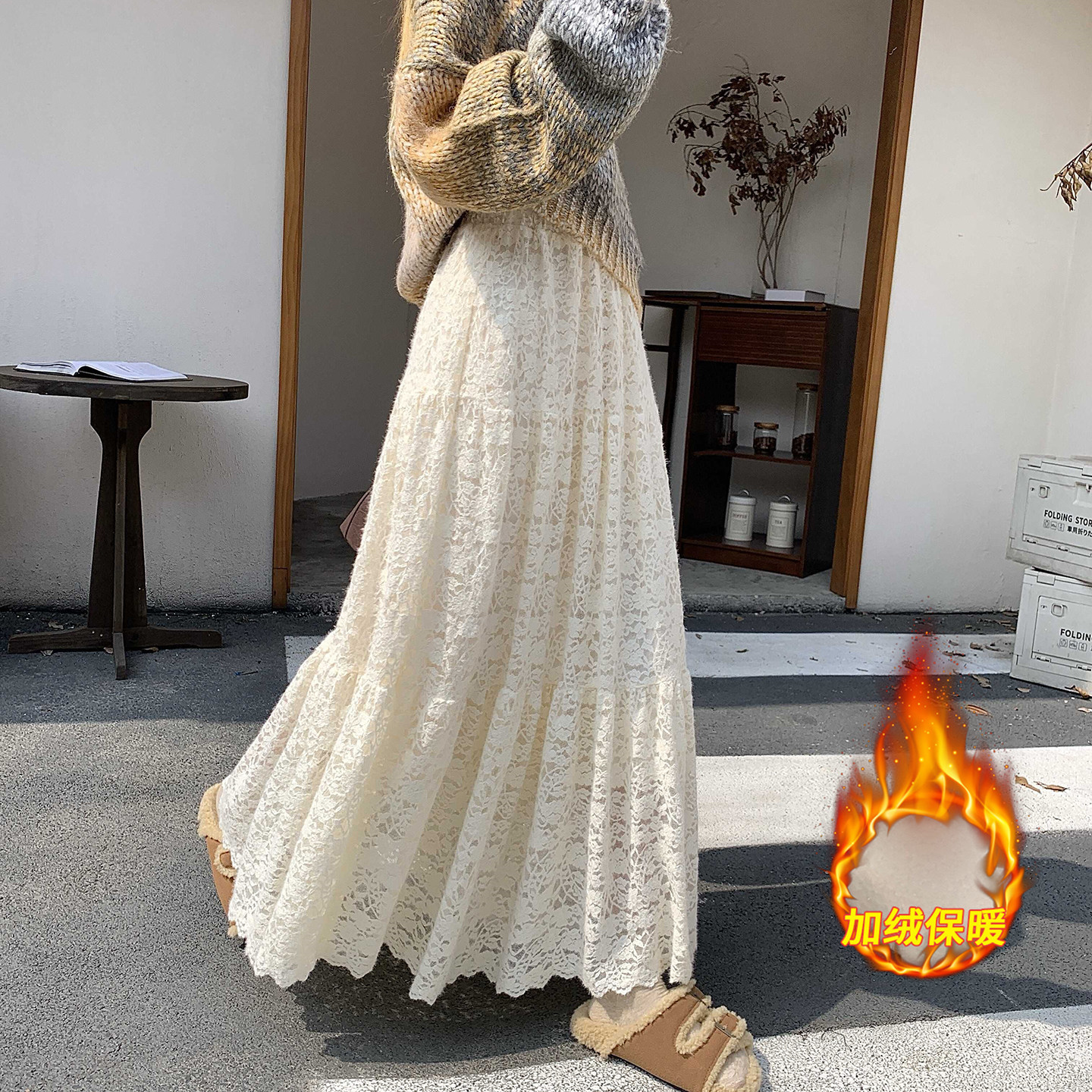 韩系甜美蕾丝加绒半身裙女秋冬2025新款温柔高腰遮跨显瘦蛋糕长裙
