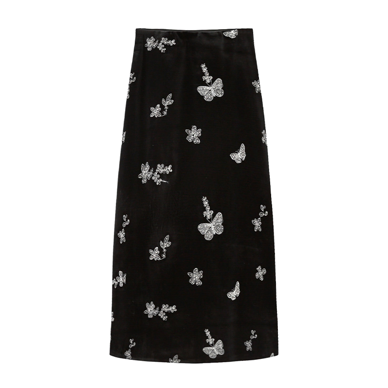 新中式丝绒半身裙女2025秋冬新款高腰重工国风黑色a字中长裙