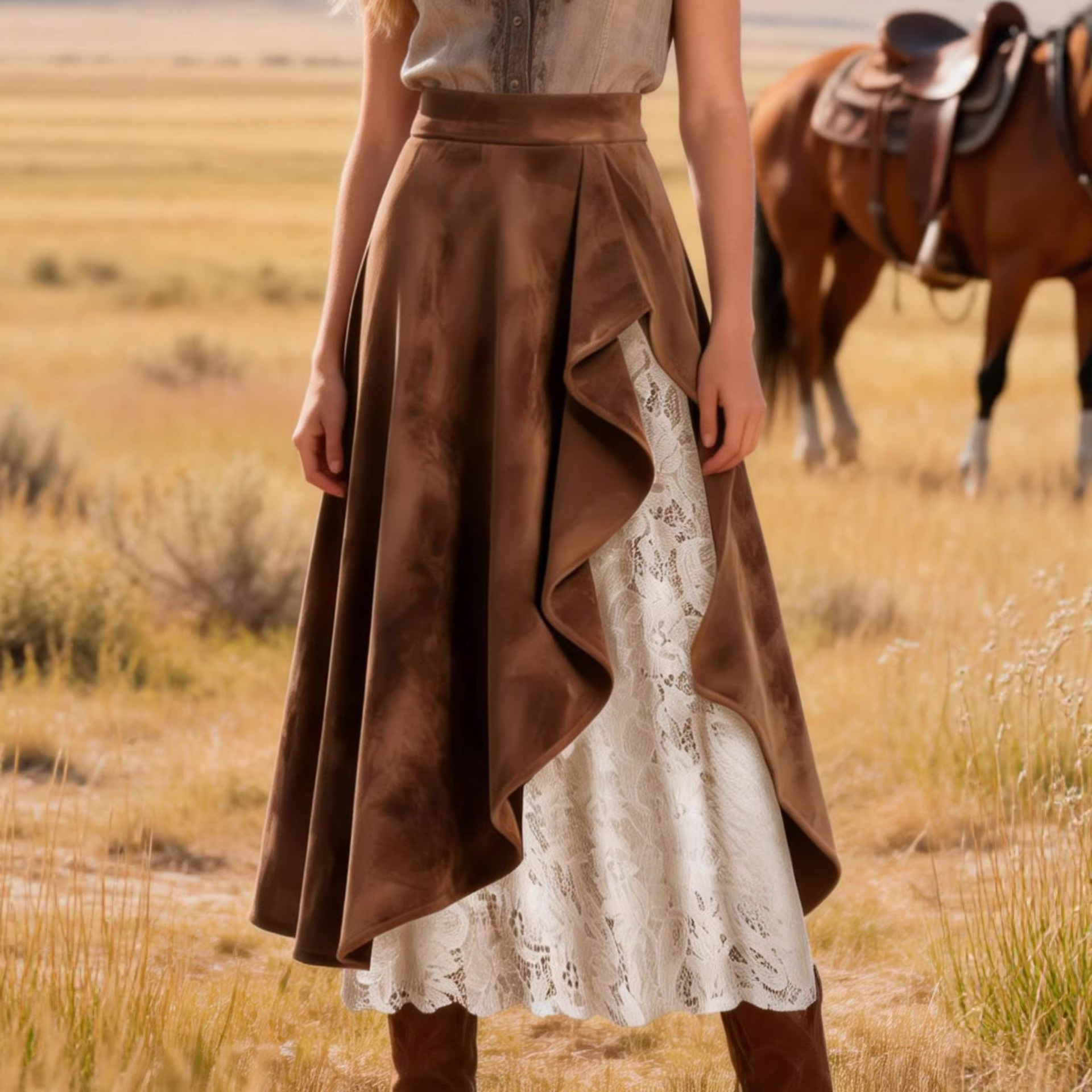 跨境欧美 亚马逊独立站新款女士复古西部风麂皮蕾丝拼接半身裙