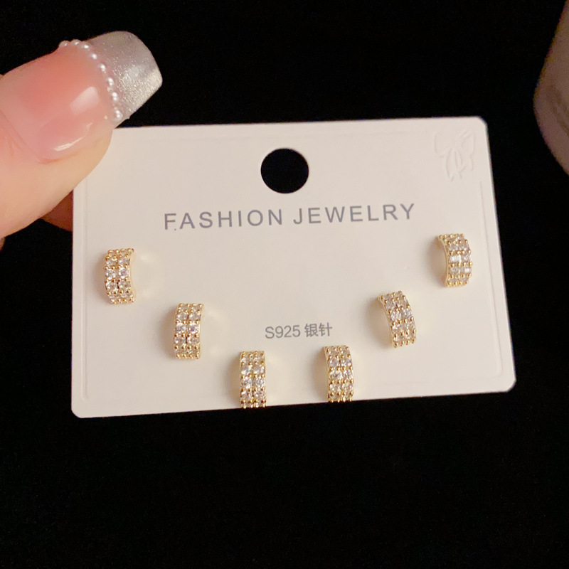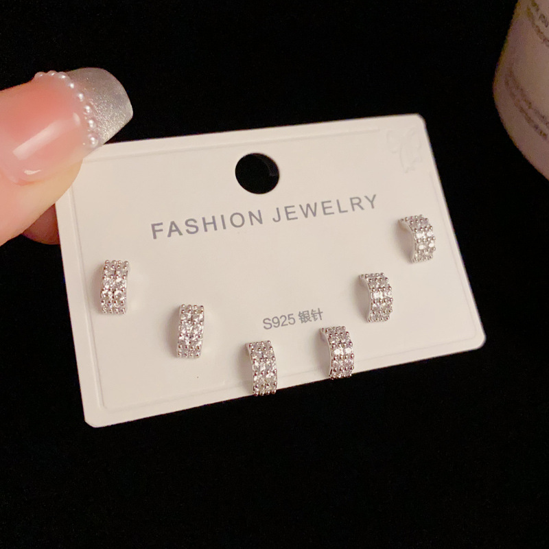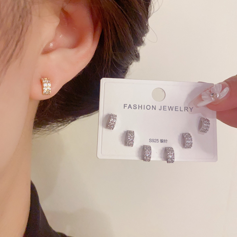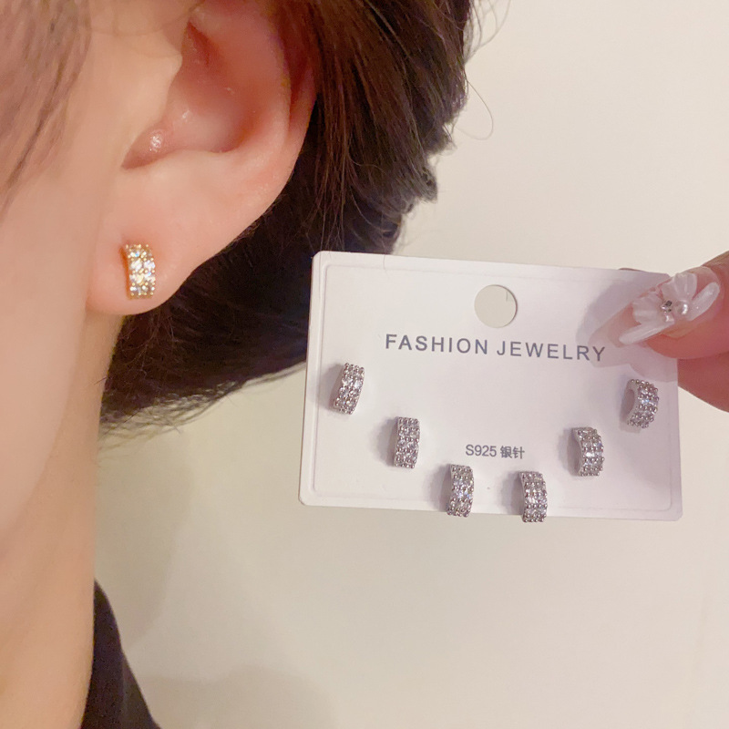 S925銀針気質ファッション満ドリル角形三点セットピアス女性の洗練されたコンパクトなデザインイヤリング卸売り