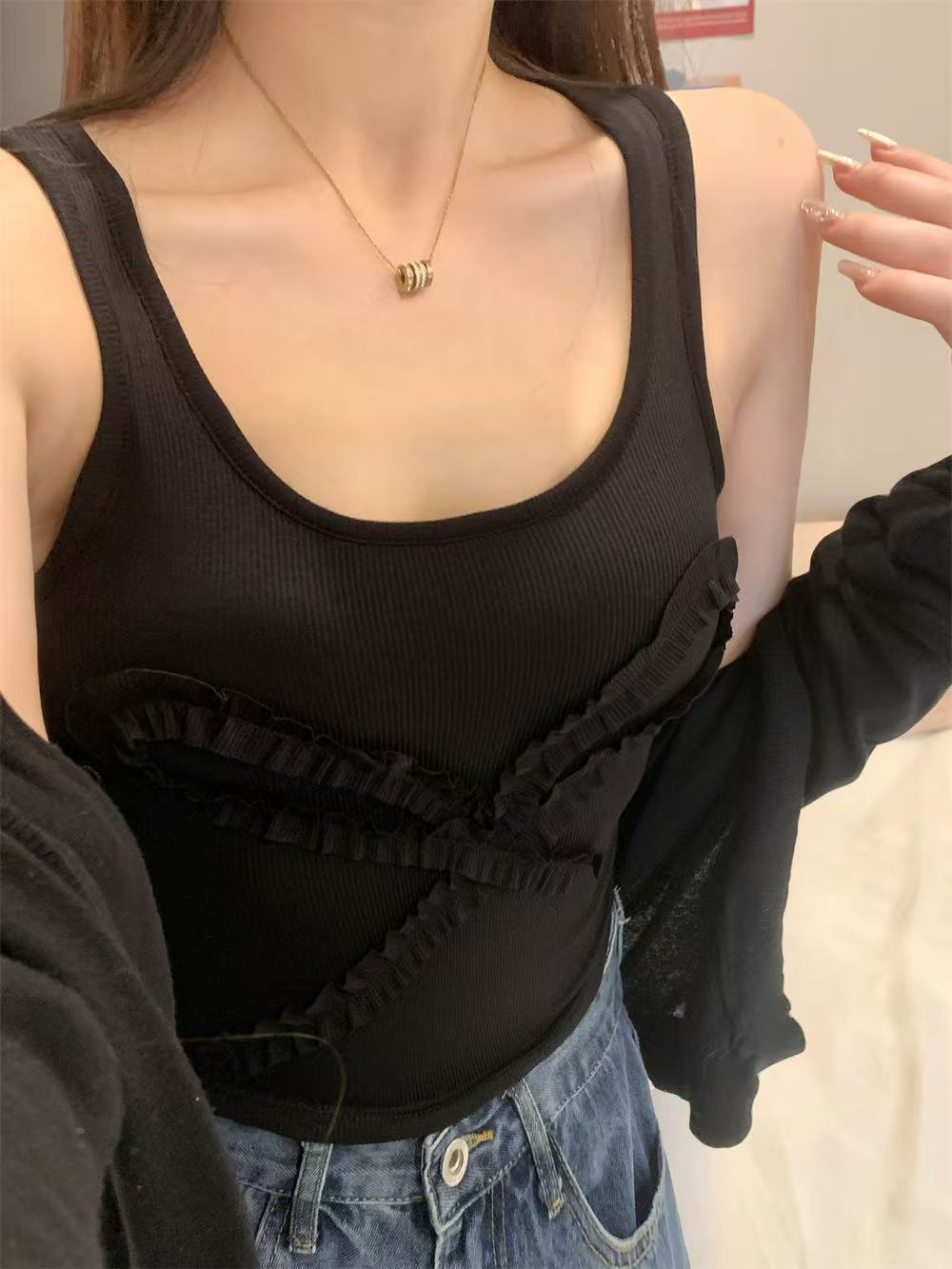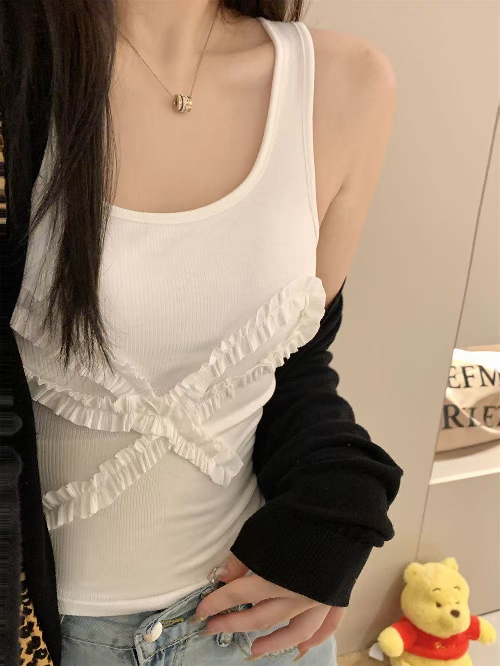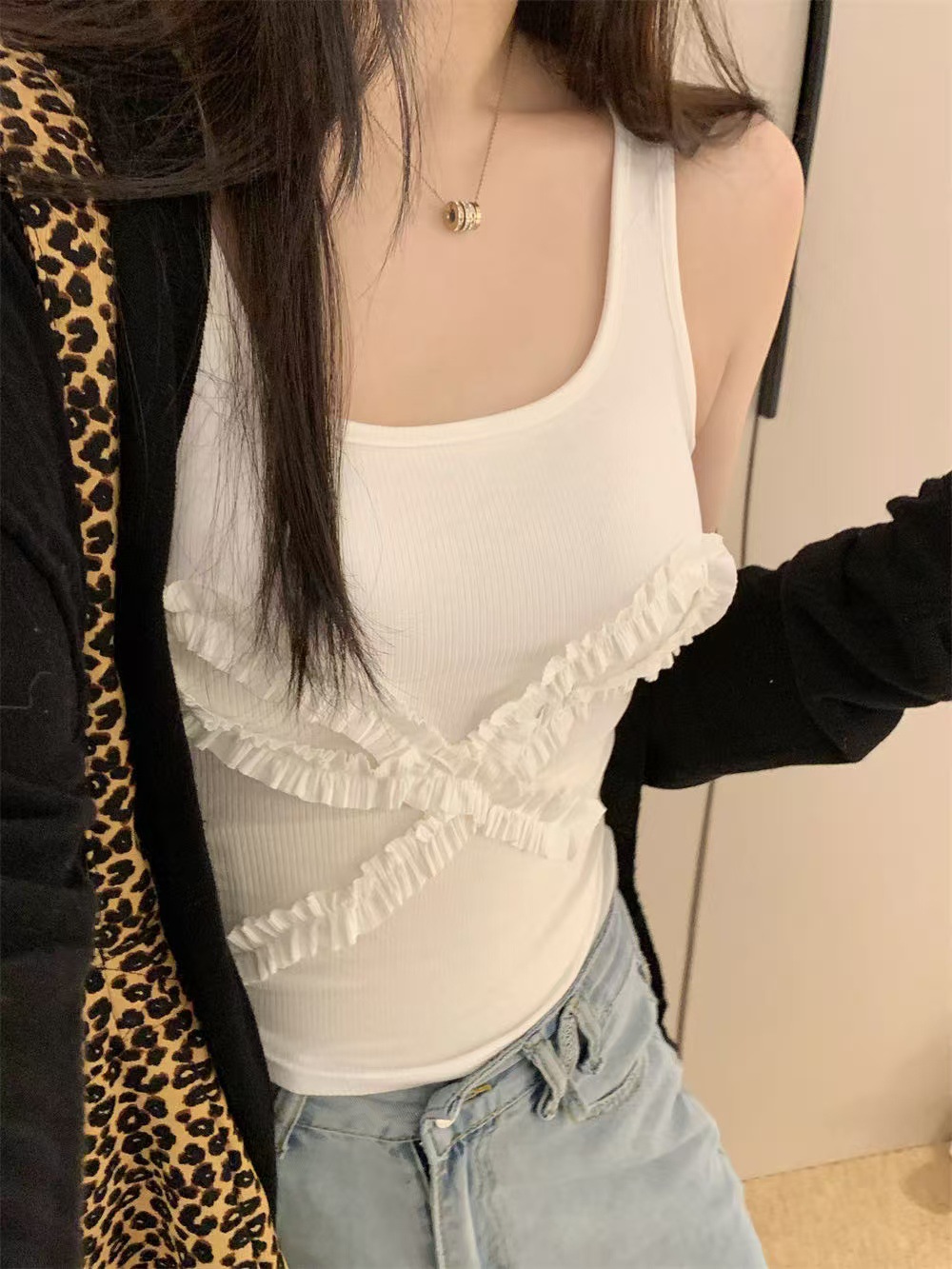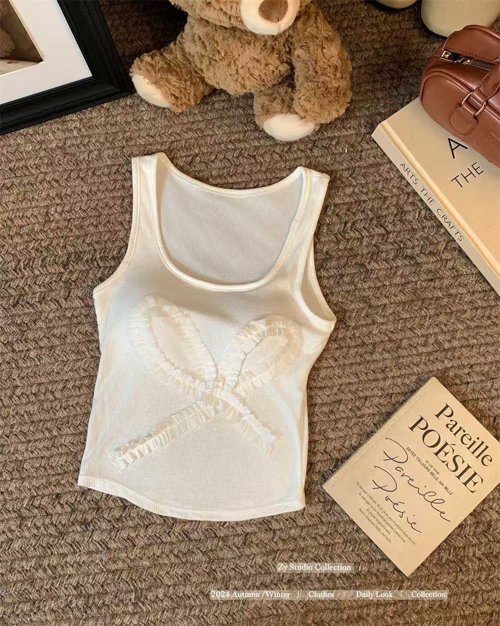 白いストラップベストの女性の夏のインナーには、胸パッド付きの蜘蛛の巣があります。