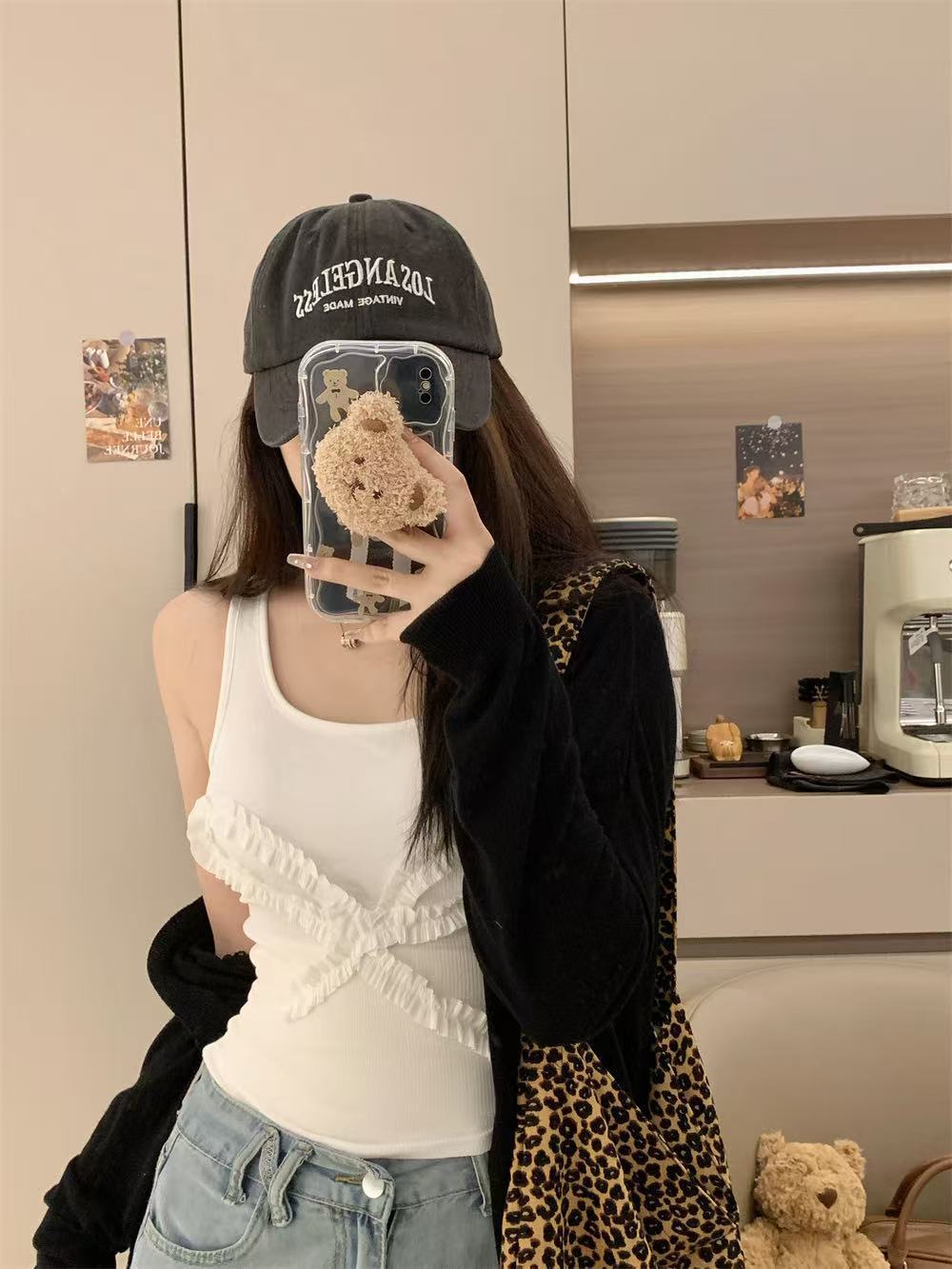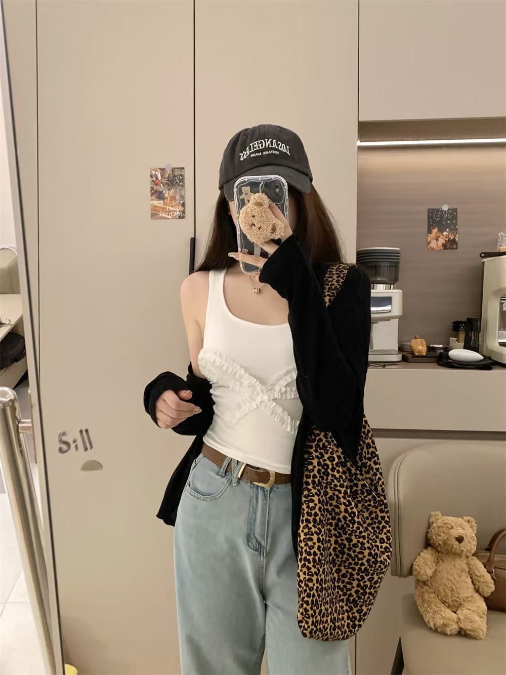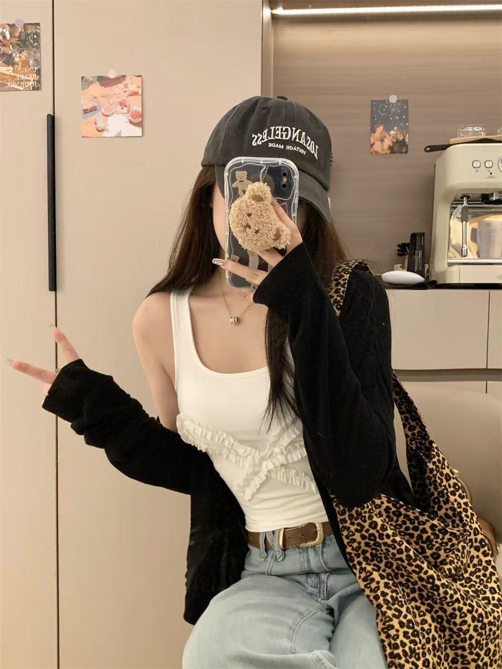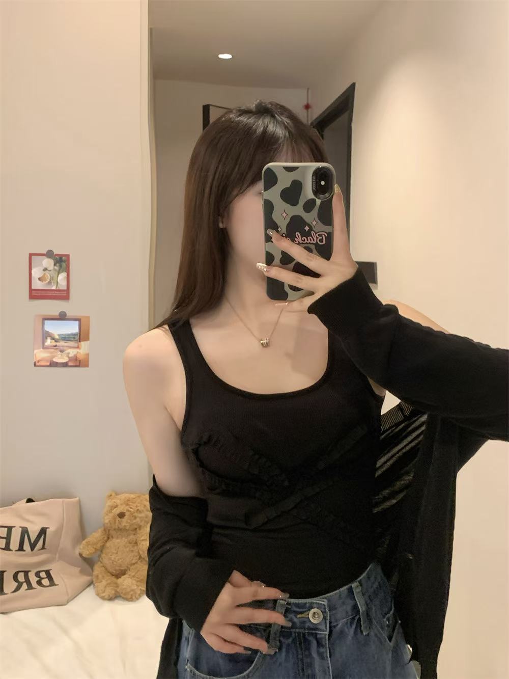 白いストラップベストの女性の夏のインナーには、胸パッド付きの蜘蛛の巣があります。