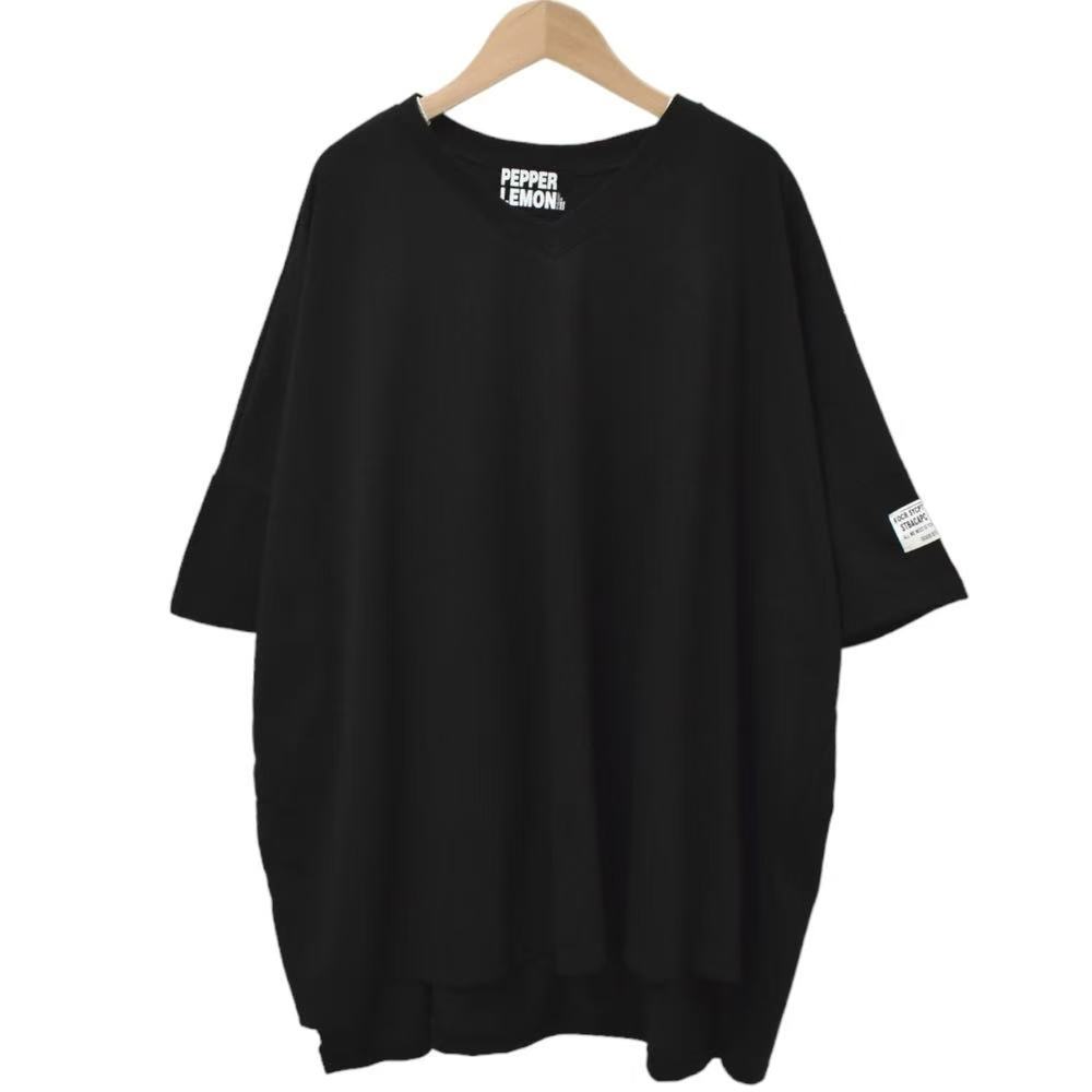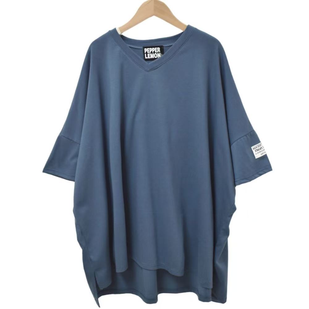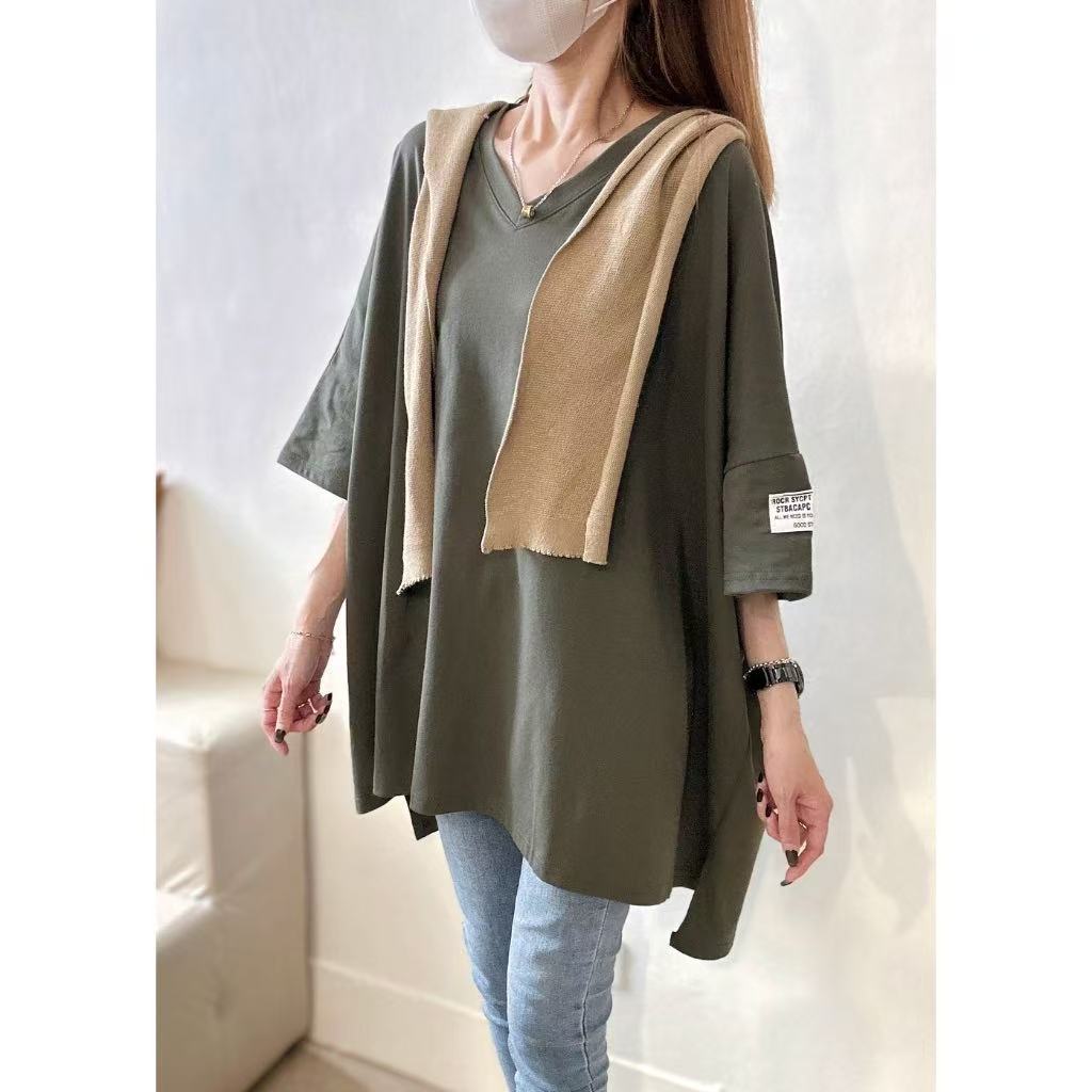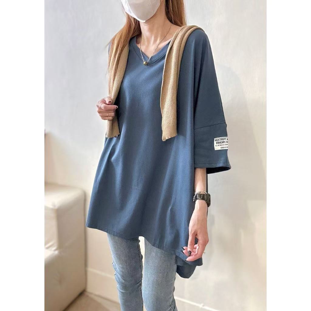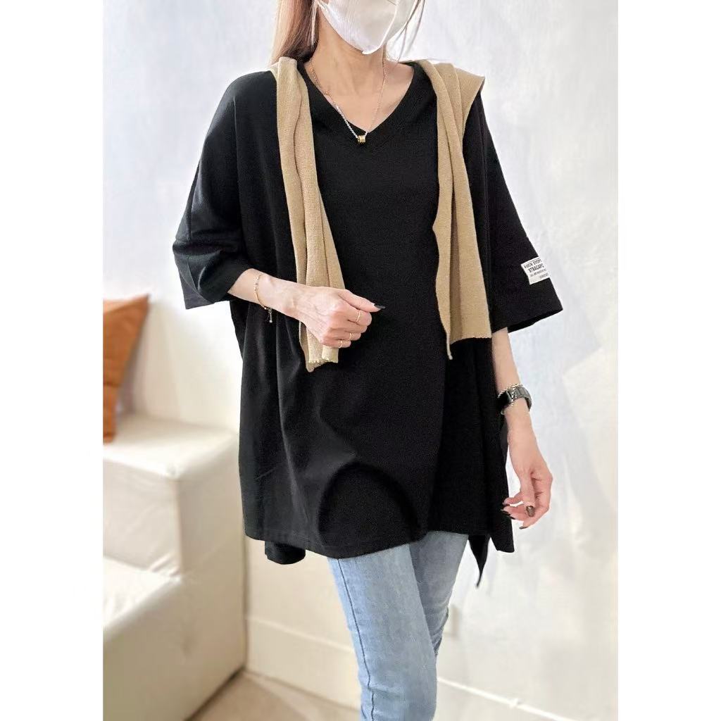 2025年夏の新型韓国版ゆるいtシャツvネックには、カジュアルな中長サイズの半袖サイズが貼られています