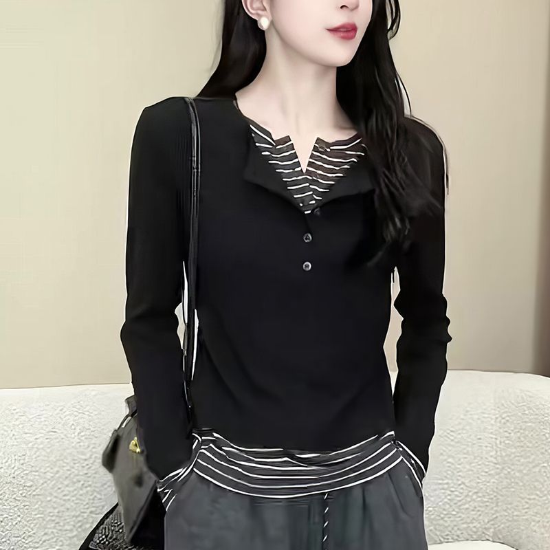 秋新款胖mm大码女装时尚扎染百搭简约条纹拼接假两件打底长袖上衣
