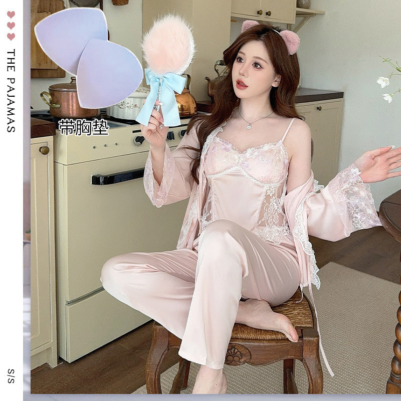 レディースホームウェア3点セット キャミソール ロングパンツ ガウン 刺繍レース 甘め シンプル エロティック系 女子パジャマ