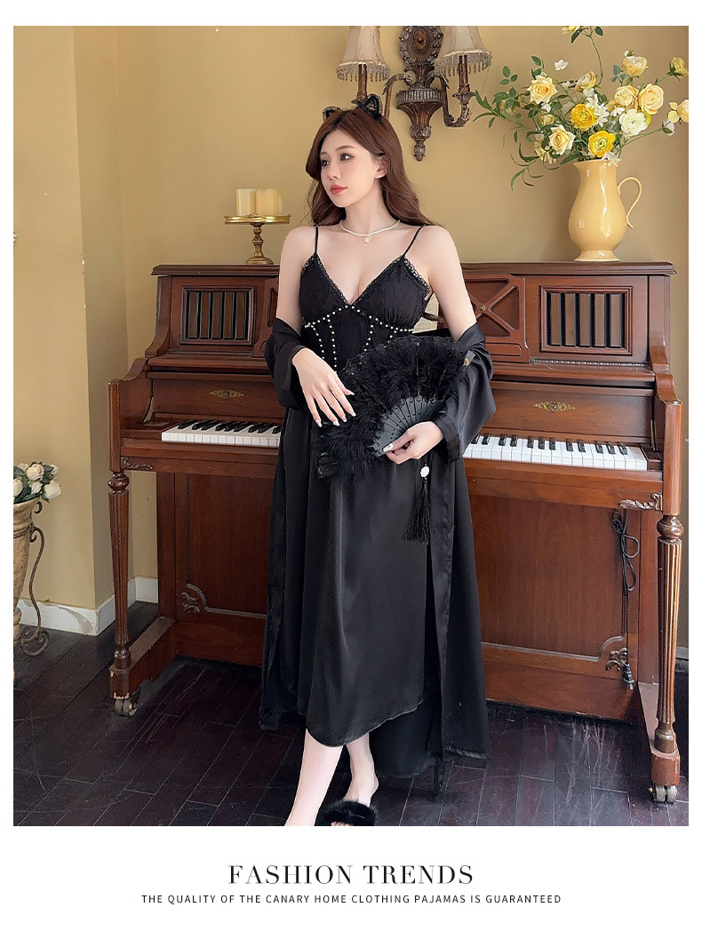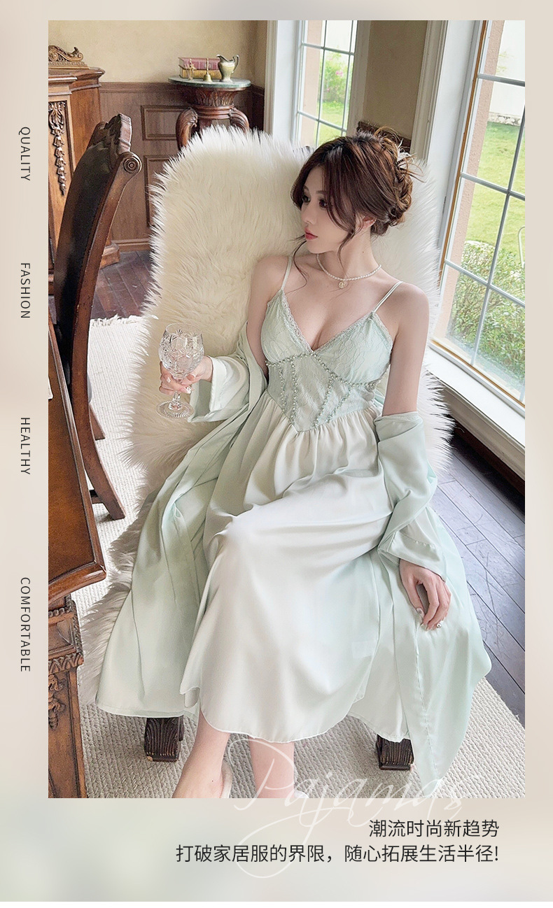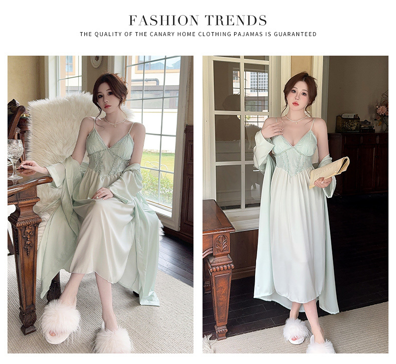 レディースパジャマ、カジュアルホームウェア、エレガントでファッショナブルなローチョップサテンシフォンロングスリップ、ナイトガウン、ツーピースセット