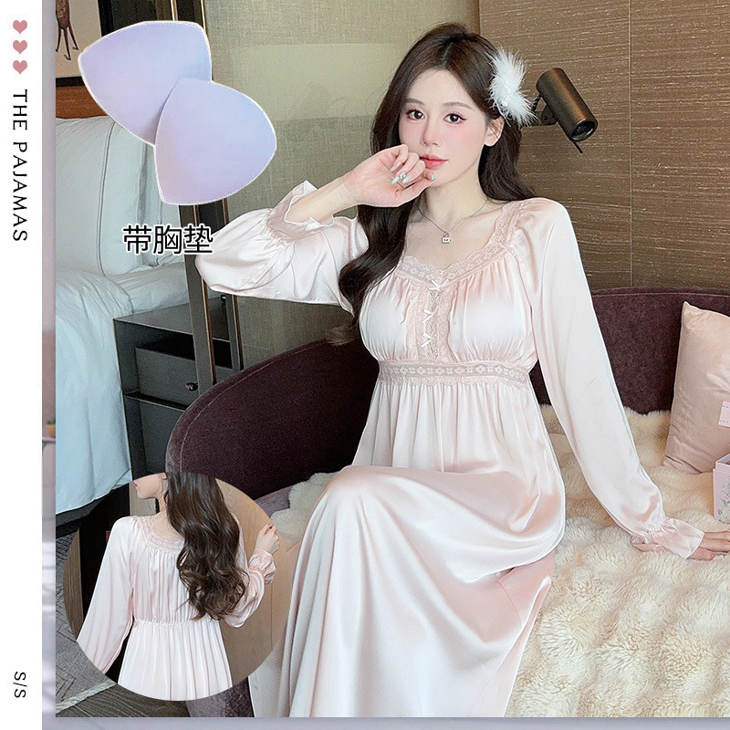 甘美なフランスの長袖の寝スカートのレースの襟元の頭の長いスカートのパジャマの部屋の服は肌の快適なサテンのパジャマにキスします。
