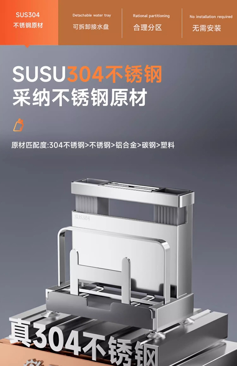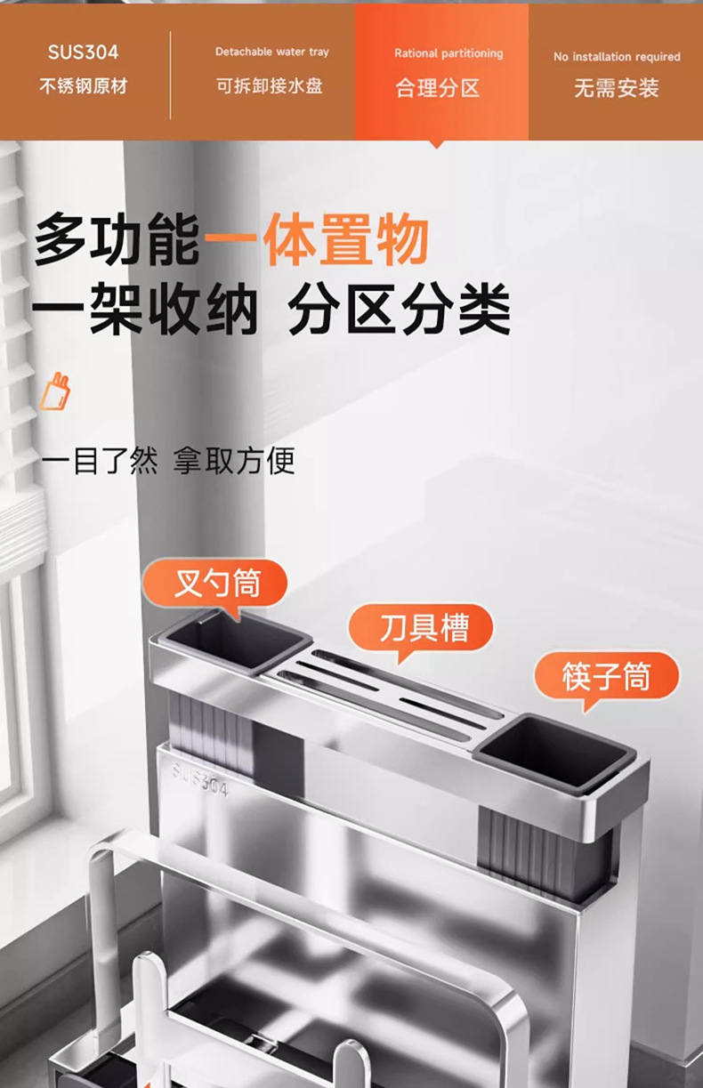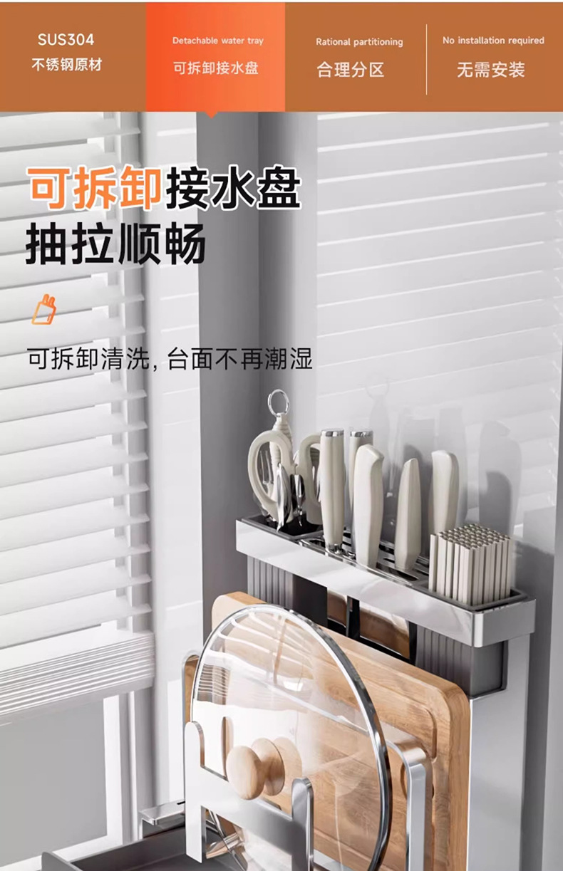 304 ステンレス鋼の包丁ラック、箸チューブ収納ラック、多機能ナイフとまな板ラック、一体型排水収納ラック