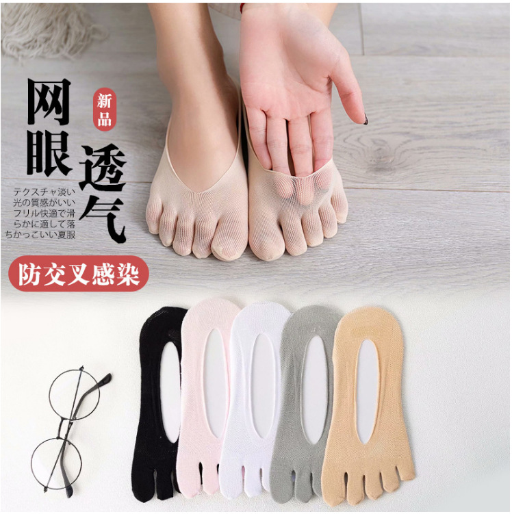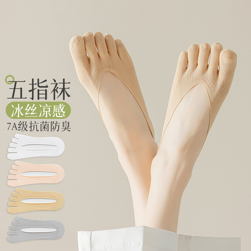 女性用5本指ソックス、春夏のスプリットトゥソックス、浅い口、目に見えない、落ちない、アイスシルクボートソックス、滑り止めシリコン通気性ソックス