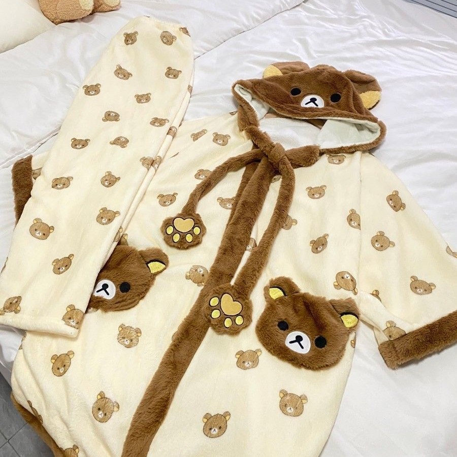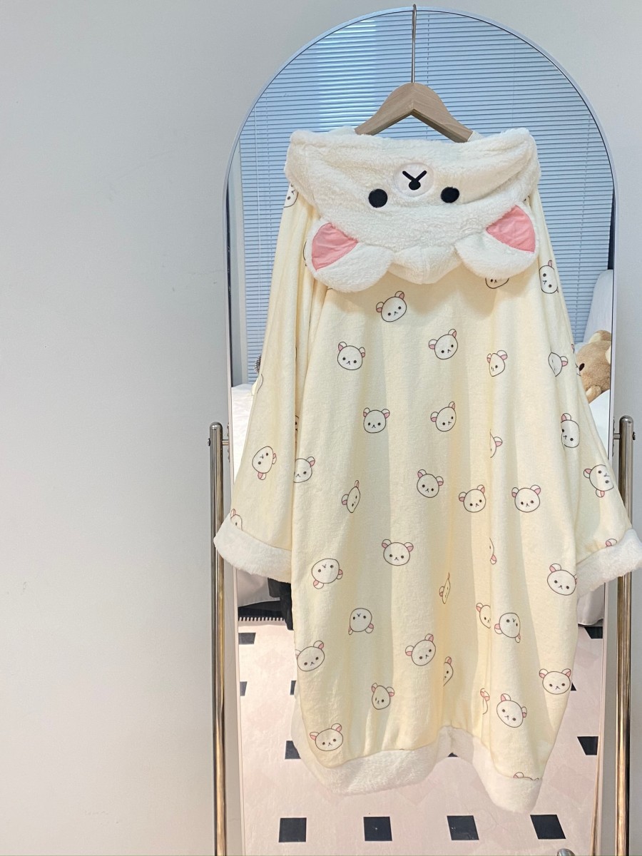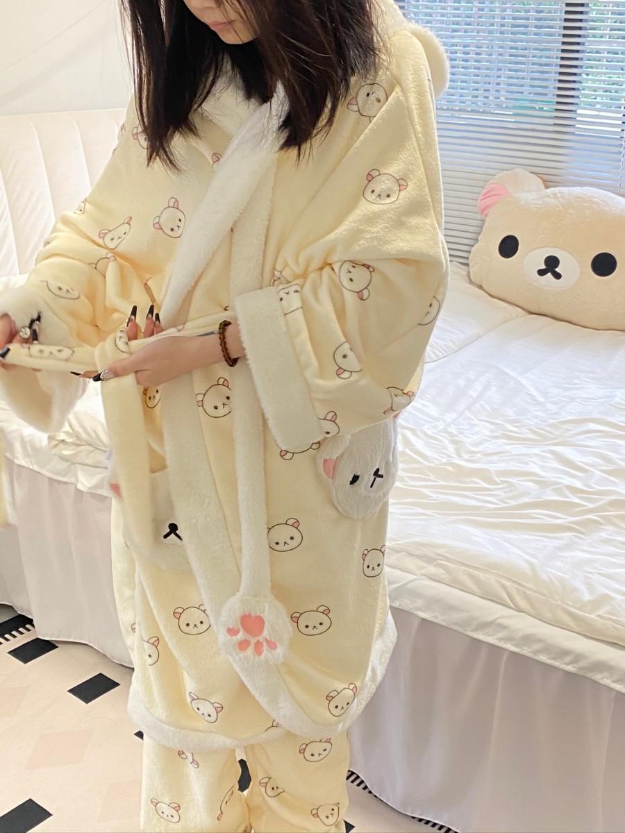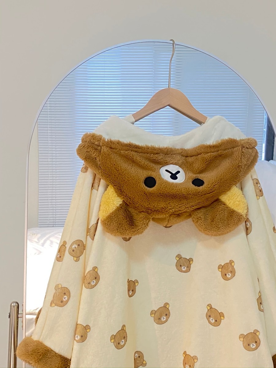 可爱轻松熊睡袍套装冬季法兰绒加厚连帽刺绣睡衣中长款斗篷家居服