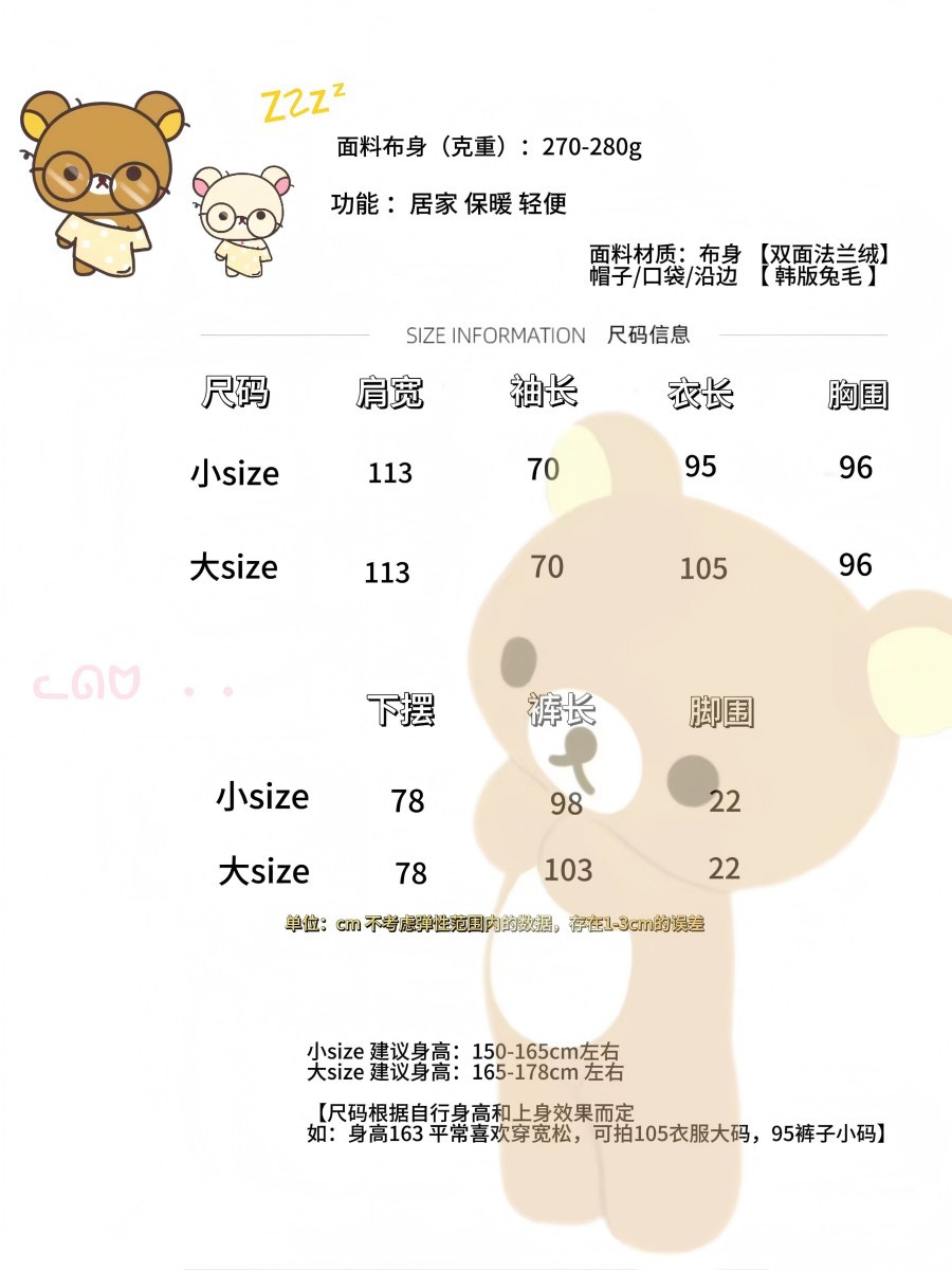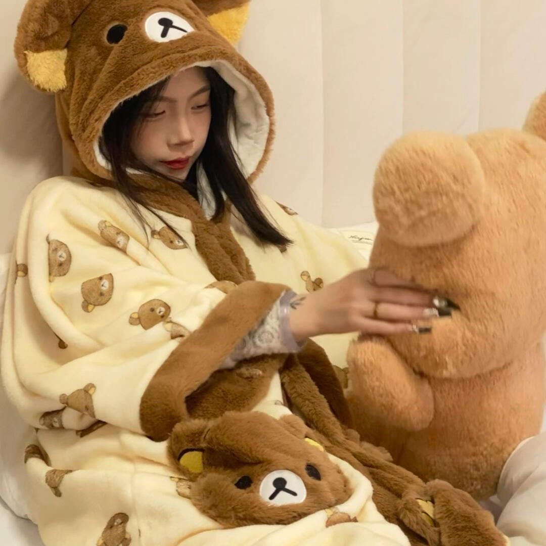 フード付きジッパーリラックマフランネルパジャマ女性の秋と冬厚く暖かい学生かわいい漫画ホーム服セット