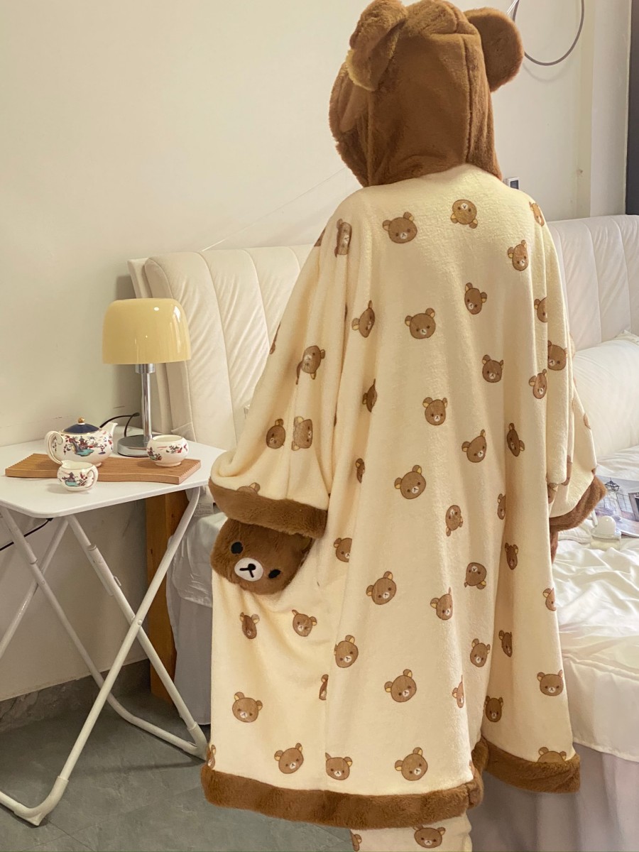 暖呼呼轻松熊斗篷睡衣女套装新款法兰绒可爱软萌家居服披肩午睡毯