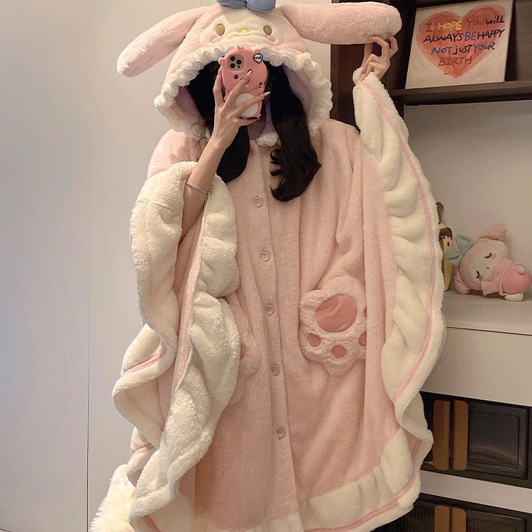 凯爱美乐蒂斗篷披风睡衣女秋冬款睡袍珊瑚绒加厚法兰绒睡裙家居服