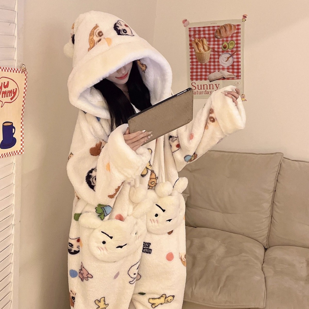 蜡笔小新连体睡衣秋冬季珊瑚绒卡通可爱甜美连帽家居服大码可外穿