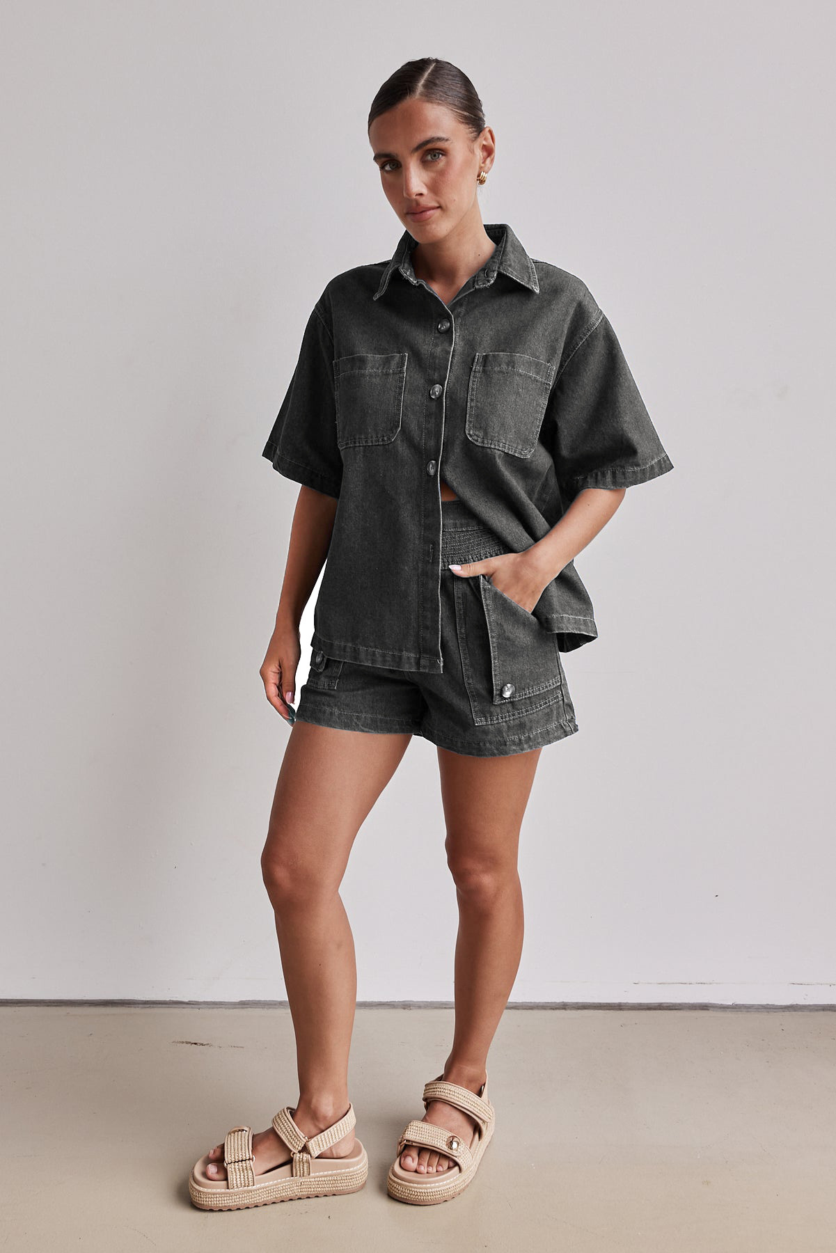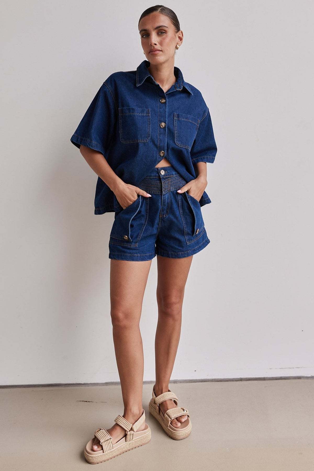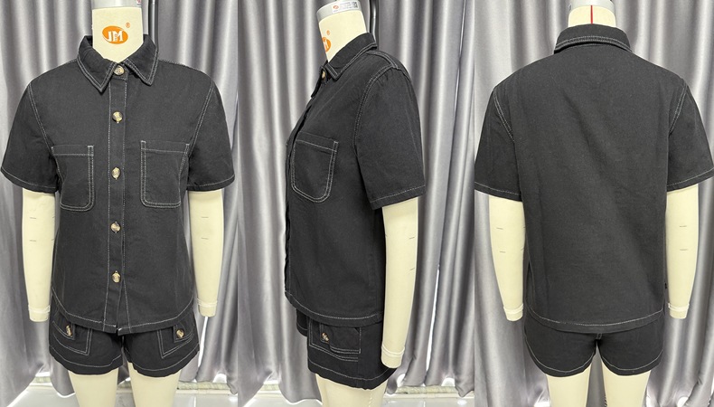 跨境欧美2025复古休闲宽松口袋短袖衬衣短裤牛仔两件遮肉显瘦套装