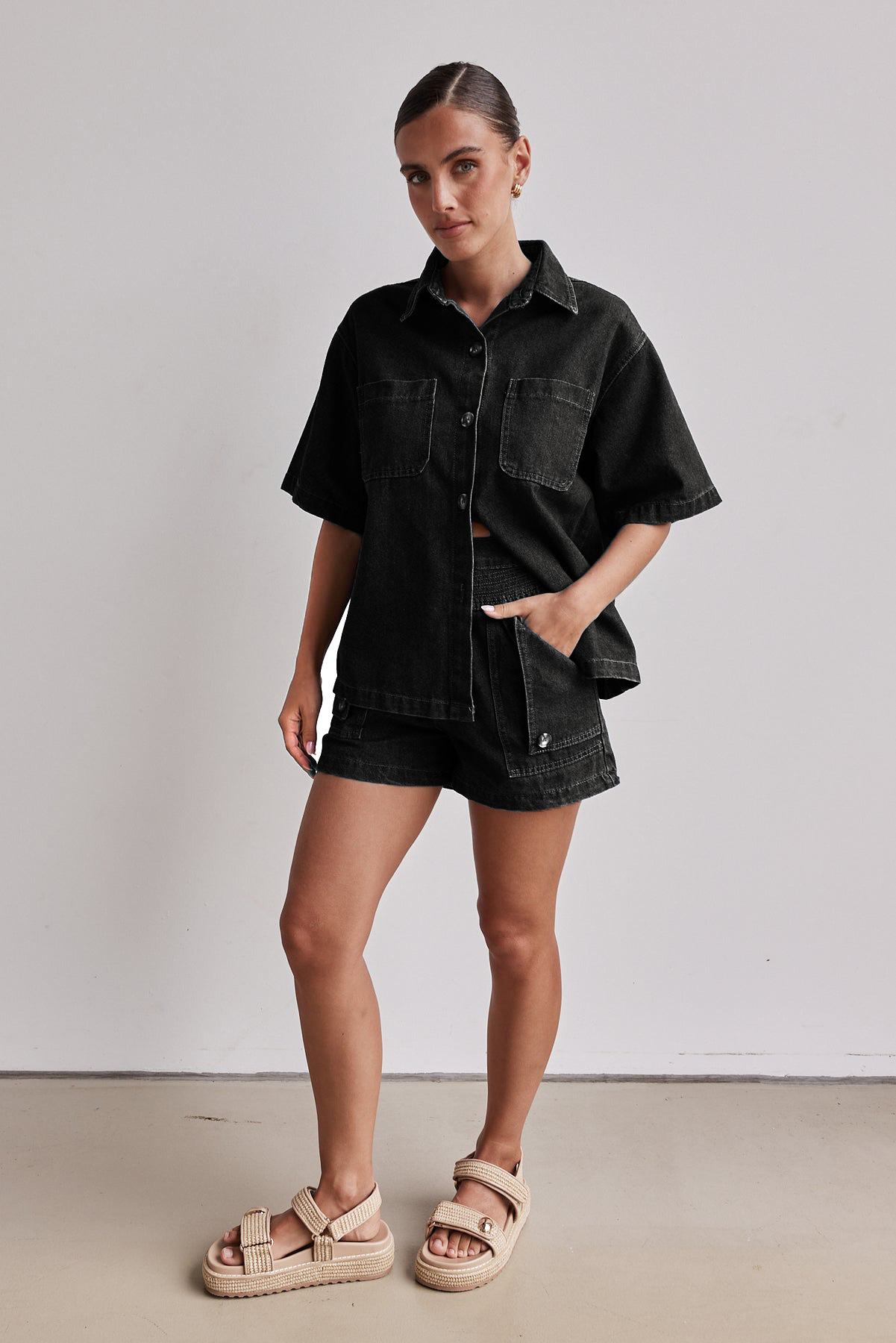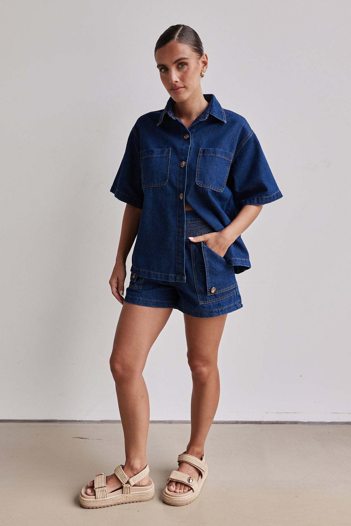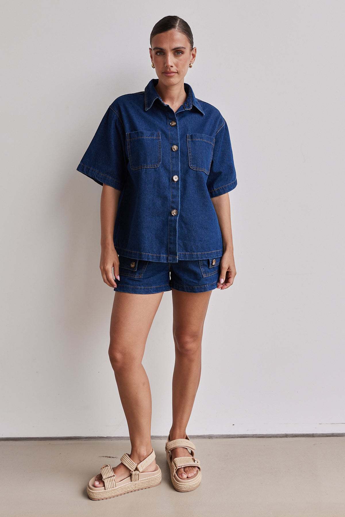 跨境欧美2025复古休闲宽松口袋短袖衬衣短裤牛仔两件遮肉显瘦套装