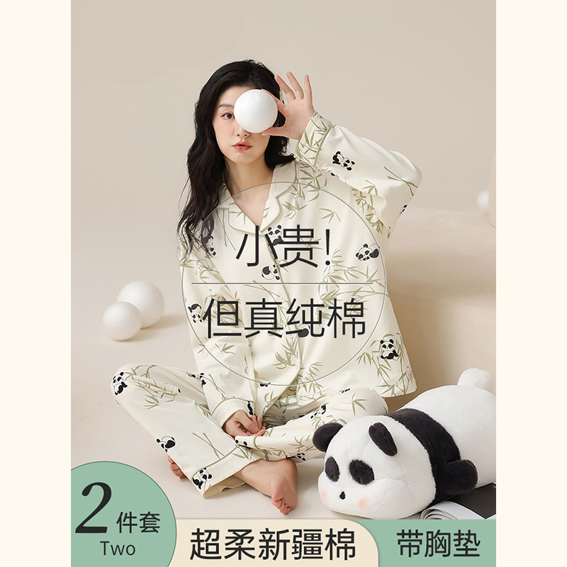 女性用卸売パジャマ、春と秋の長袖純綿パジャマ、胸パッド付き、屋外で着用可能、2025年新作ホームウェア、綿セット、秋と冬