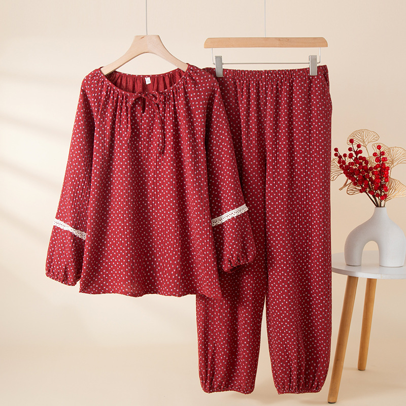 女性の純綿糸秋長袖パジャマ女性のバブル綿糸ラウンドネック水玉小さな新鮮なルーズホームウェアセット