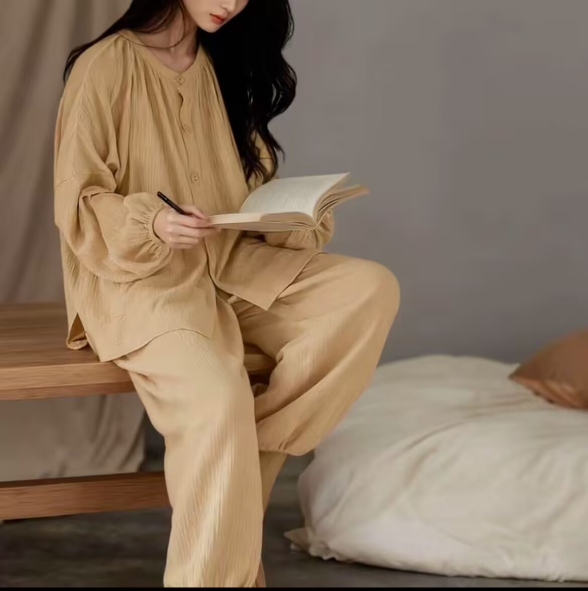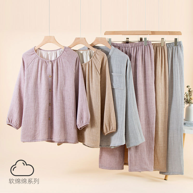 女性用パジャマ、純綿ガーゼ、春夏、爽やかな綿素材、ラペル付きセット、長袖、ゆったり、シンプル、ホームウェアセット