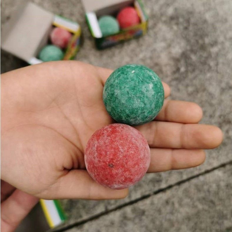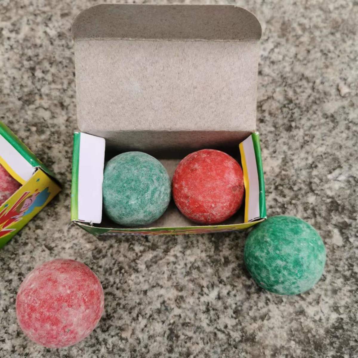 懐かしいおもちゃ80個、雷の赤と緑のボール、子供の頃の思い出、火石が煙を上げる赤と緑のボール
