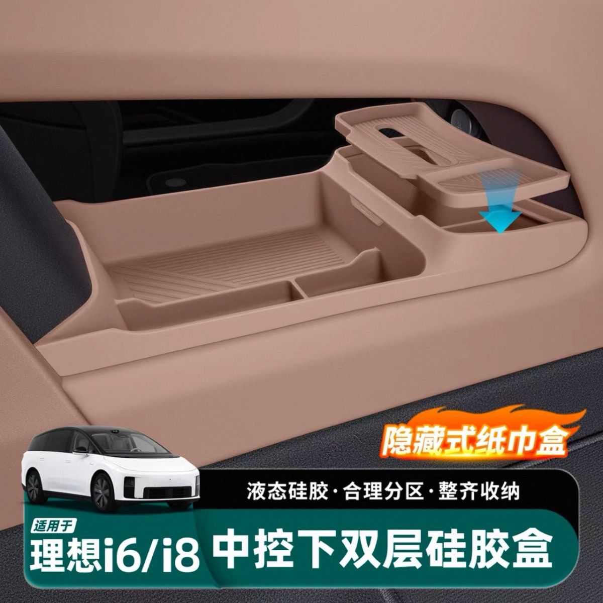 适用于理想i6i8中控下双层储物盒硅胶垫带纸巾盒车内装饰配件用品