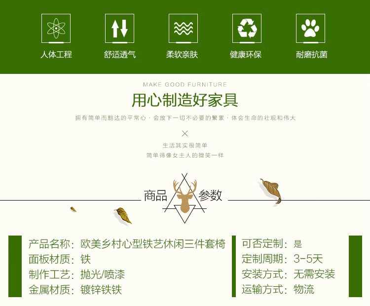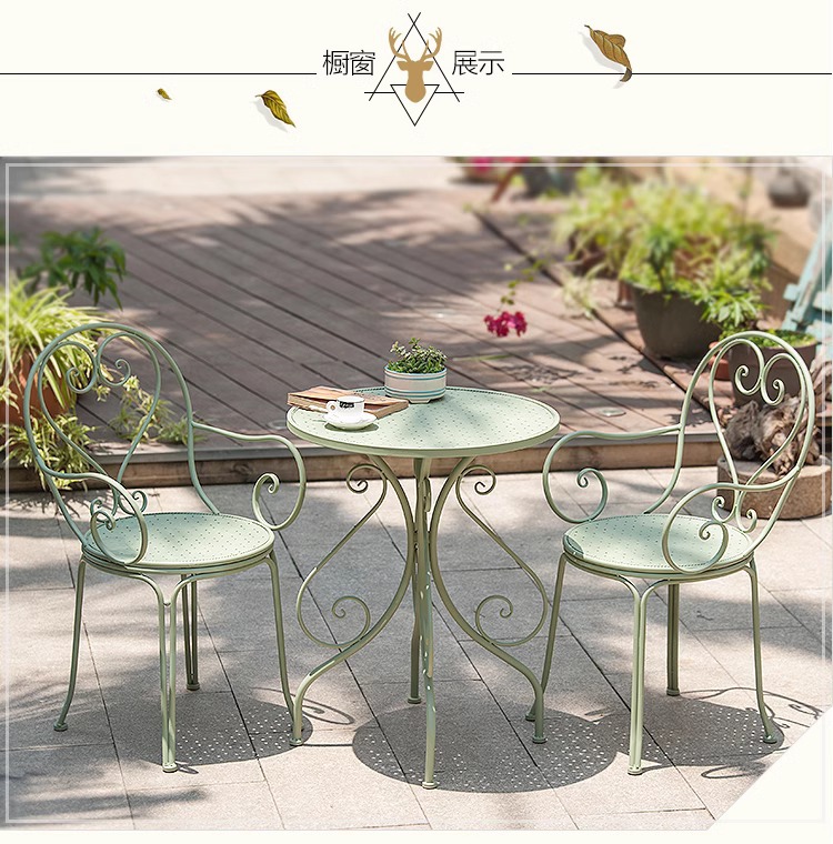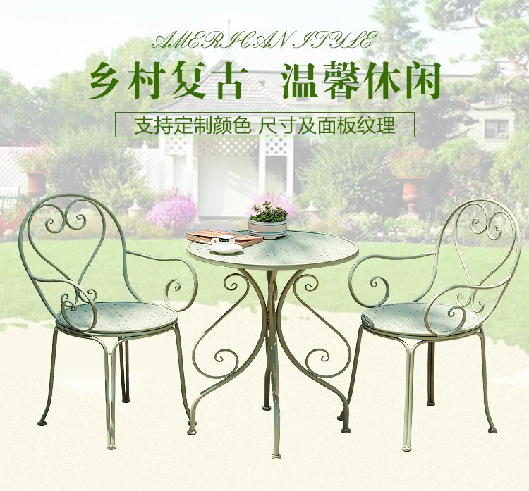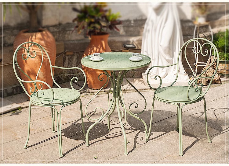 レトロ田園緑フランス式花園テーブルと椅子の庭のベランダの天台は鉄芸の椅子を畳んでレジャーします。