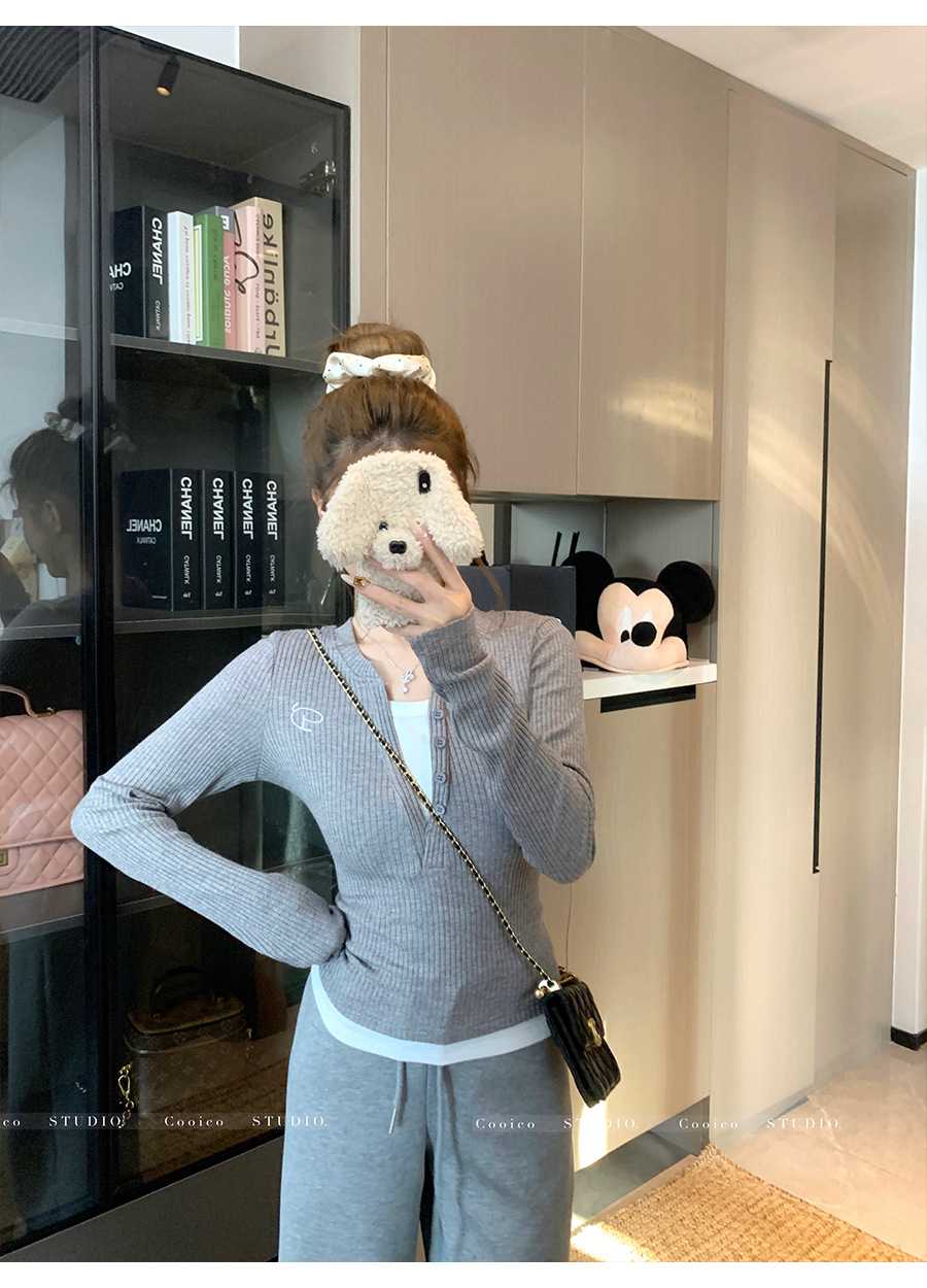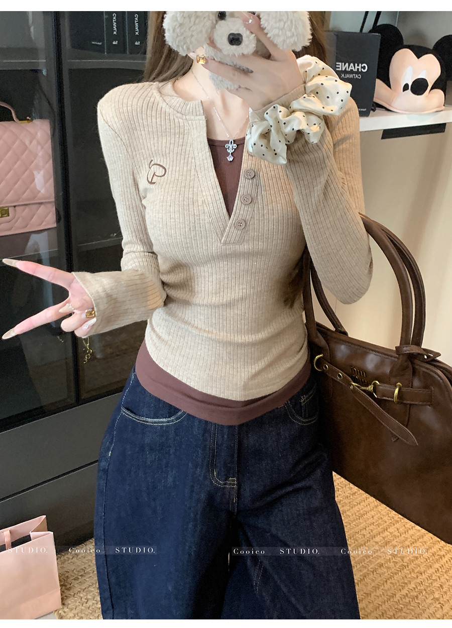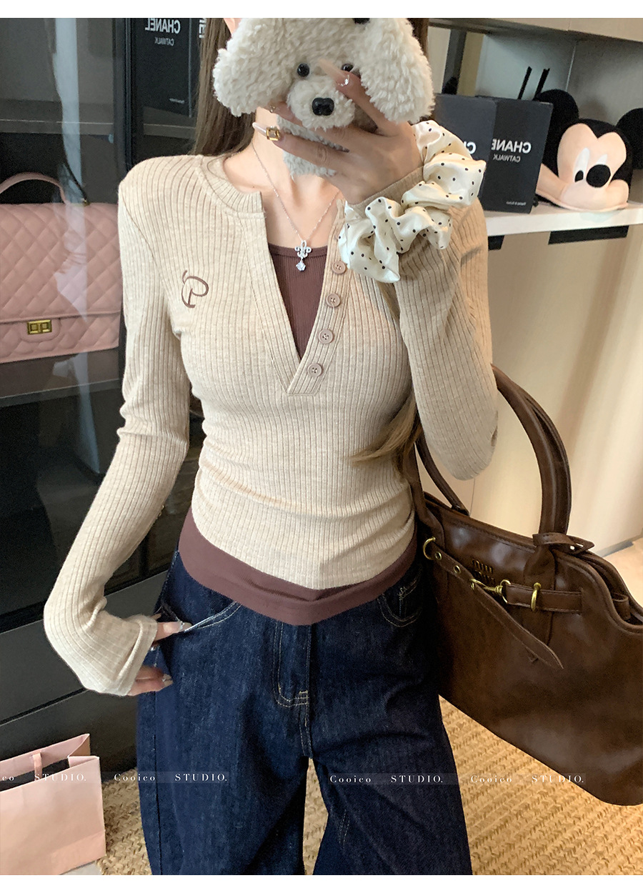 Vネック長袖フェイクツーピースデザインレディーストップス2025秋新作スリムフィット痩身Tシャツショート丈インナーレイヤードシャツ