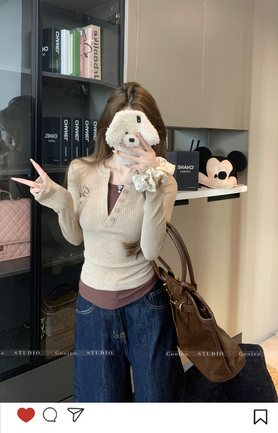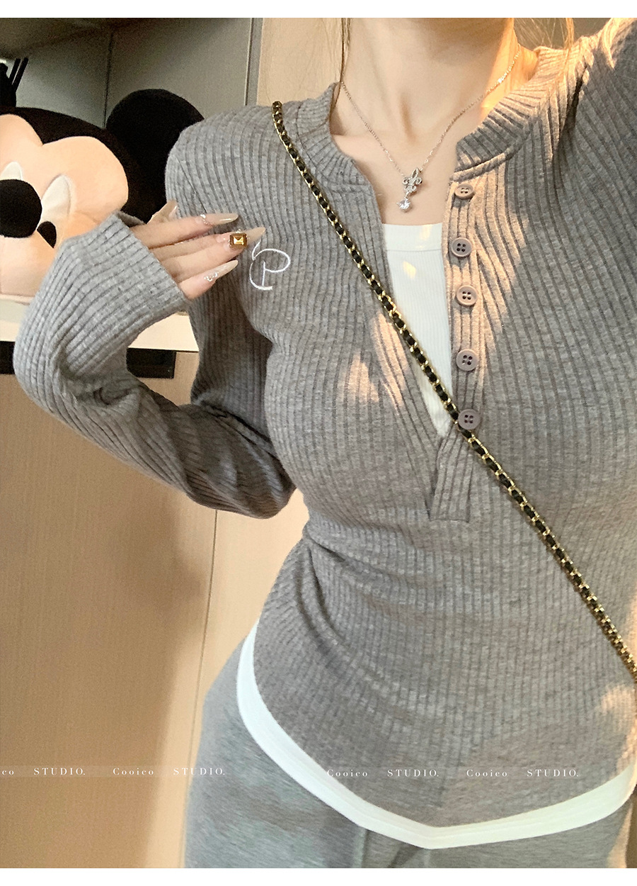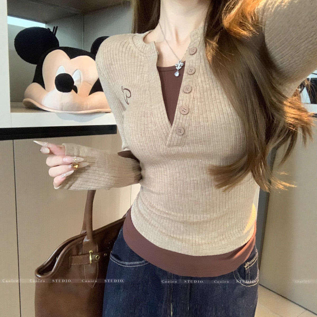 Vネック長袖フェイクツーピースデザインレディーストップス2025秋新作スリムフィット痩身Tシャツショート丈インナーレイヤードシャツ