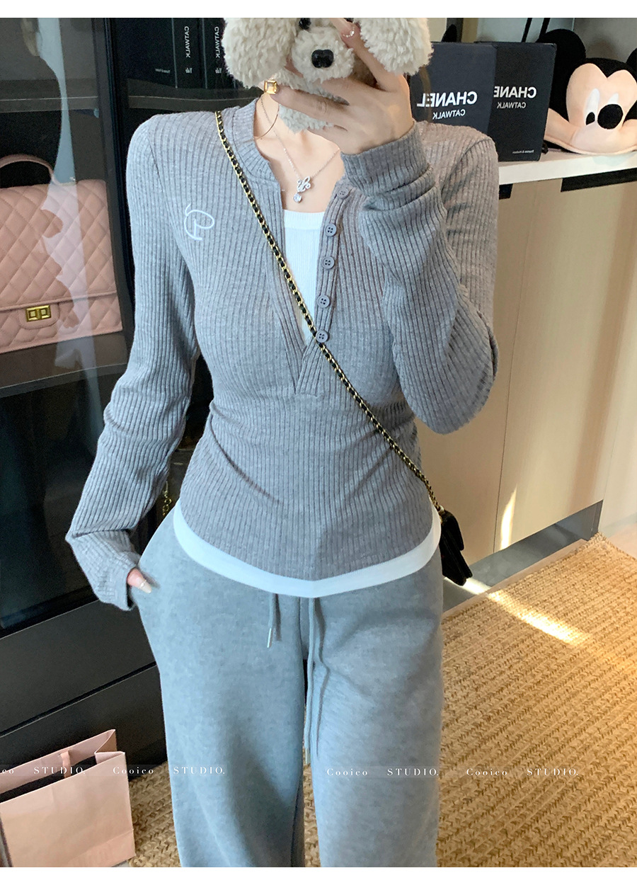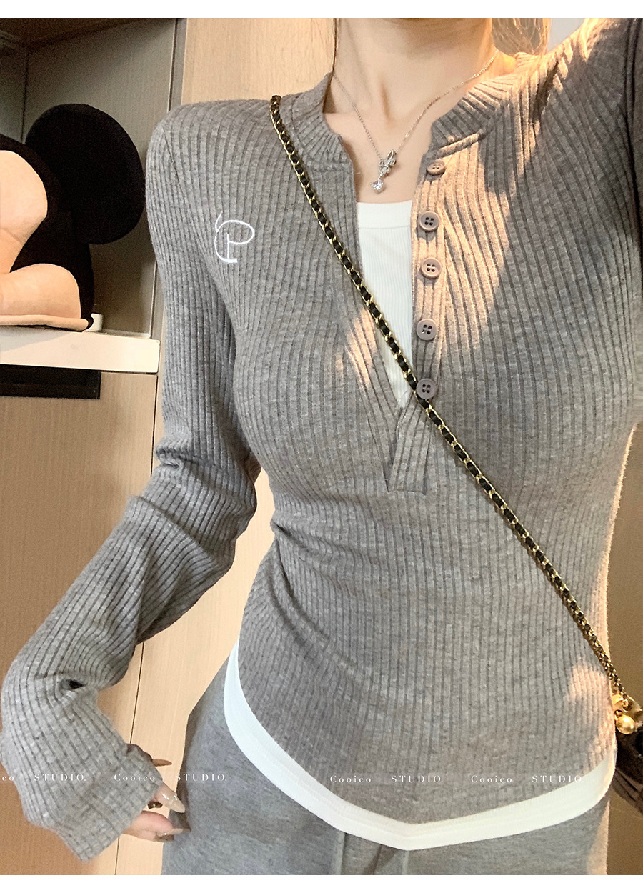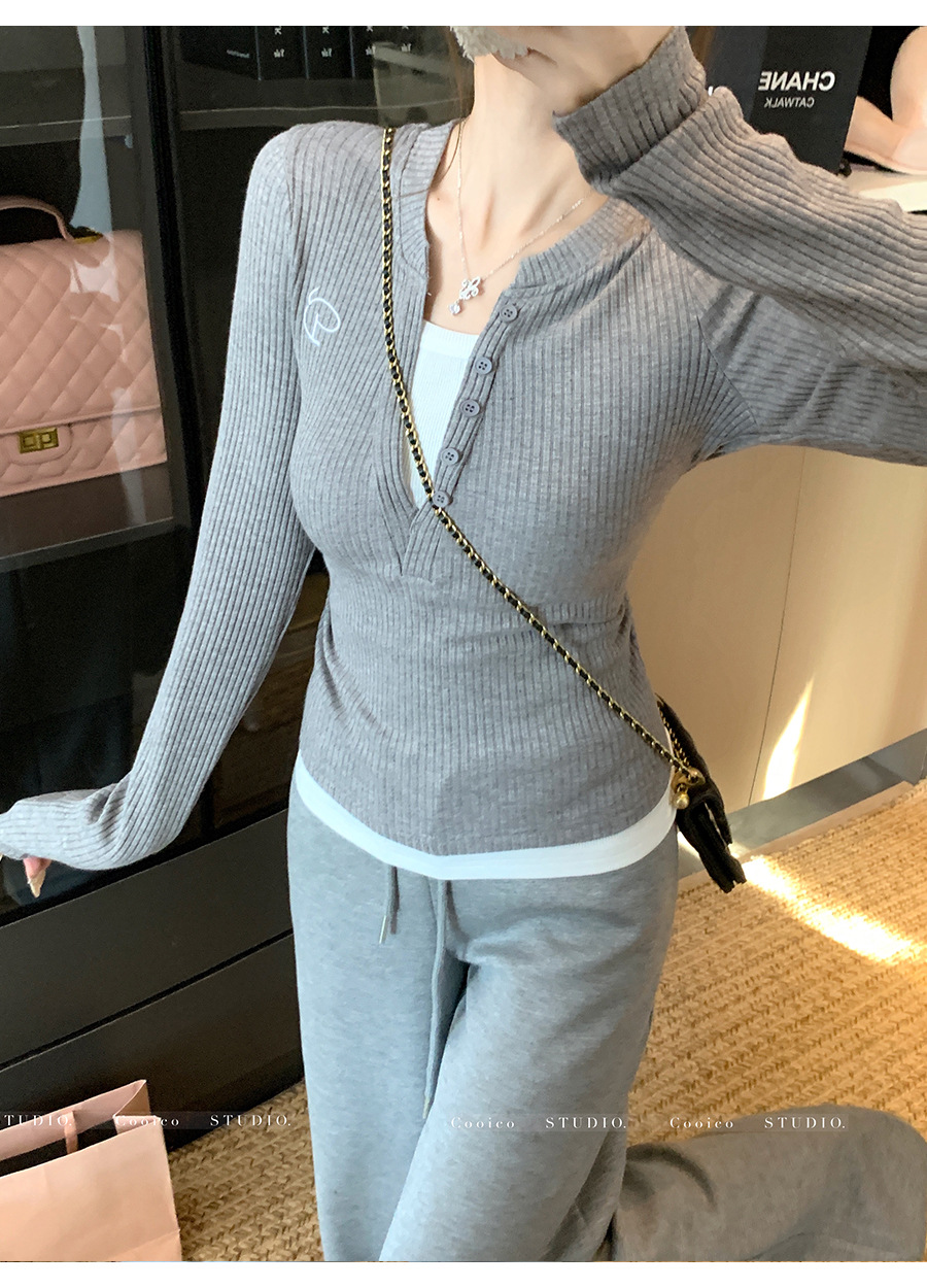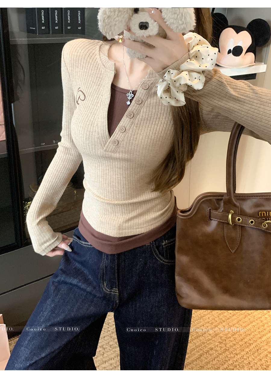 秋冬季新款针织衫小众正肩V领假两件长袖上衣女修身显瘦打底衫