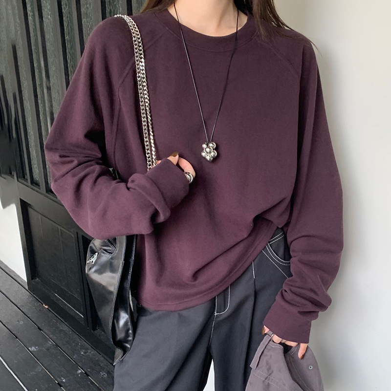 2025秋季新款简约韩版纯色圆领T恤女 休闲百搭宽松插肩袖打底上衣