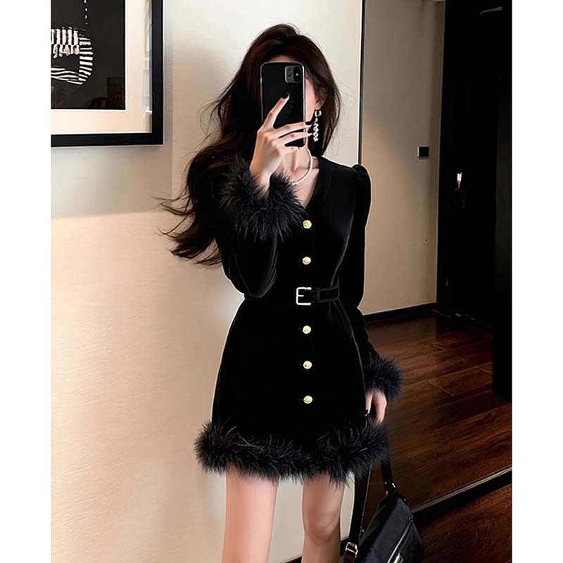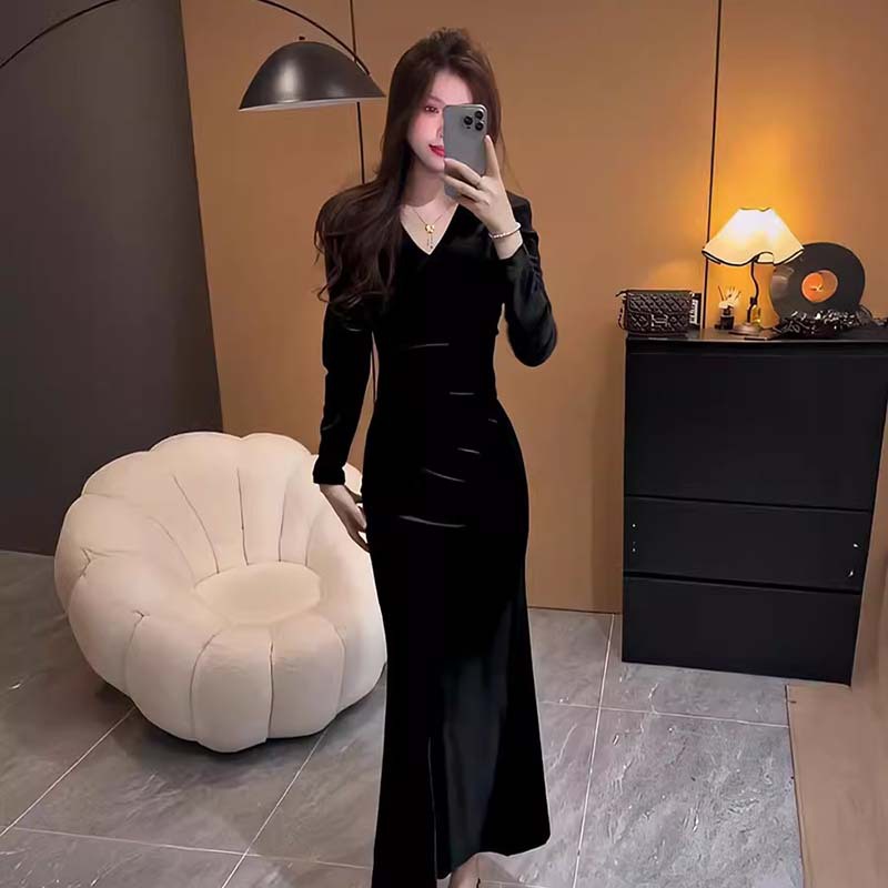 纯欲风秋冬新款气质时尚V领丝绒鱼尾连衣裙女收腰显瘦修身打底裙