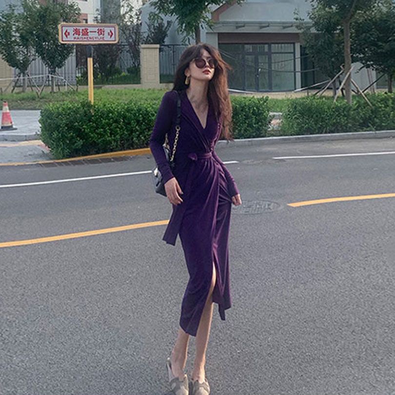 2025气质感长袖紫色轻奢百搭裙子收腰内搭修身显瘦时尚女装连衣裙