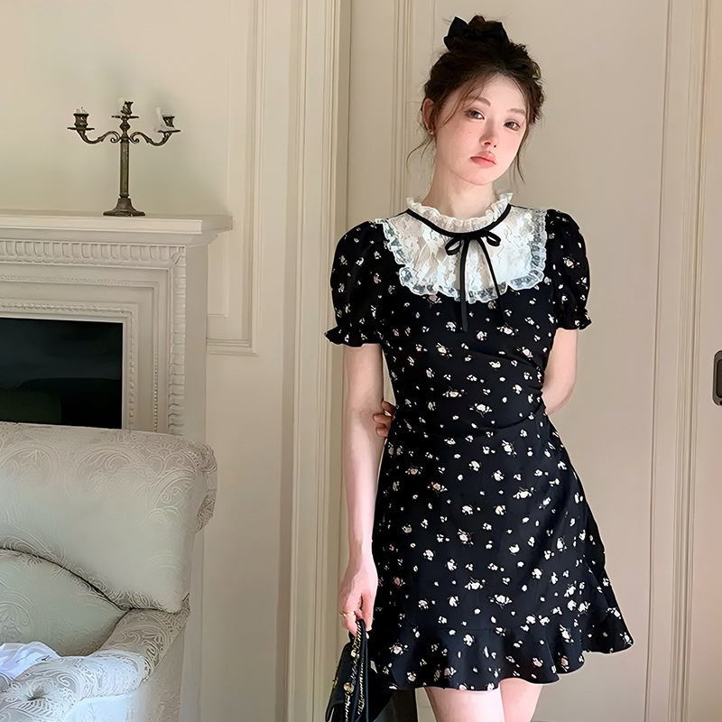フランスの千金風の花のワンピースの女性2025夏の新型の高級感の気質はやせているレースを現してスカートをつなぎます。