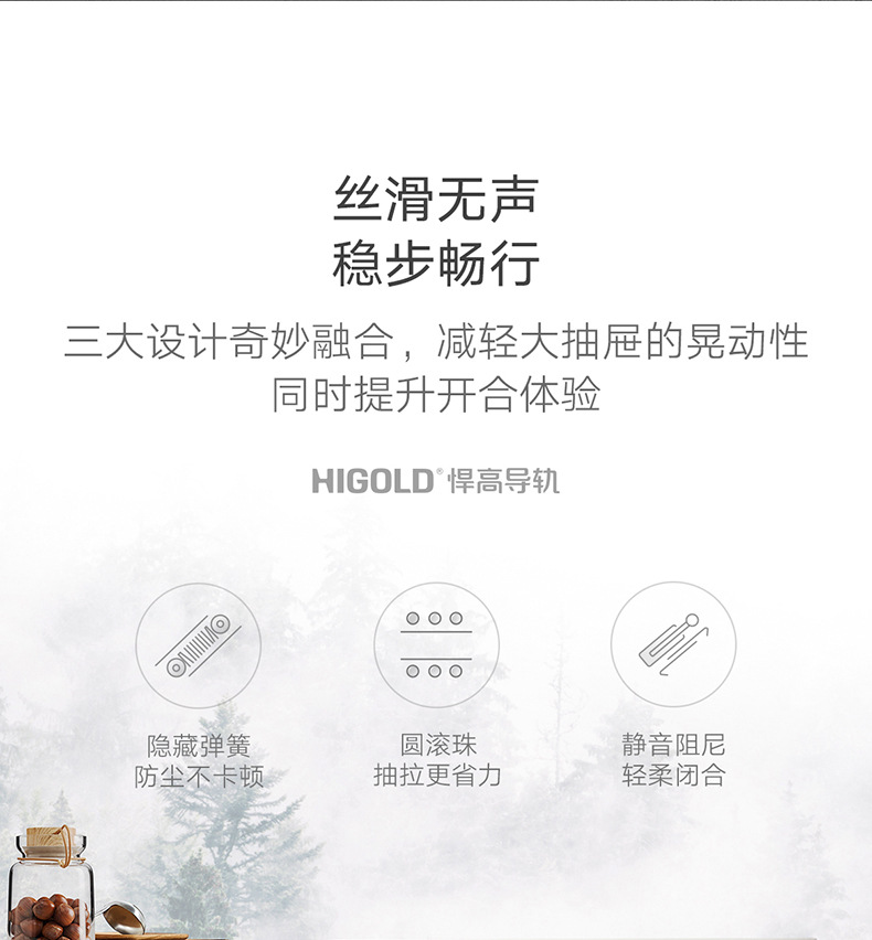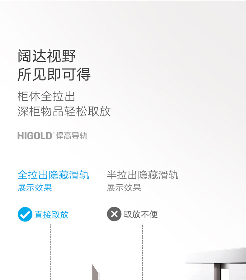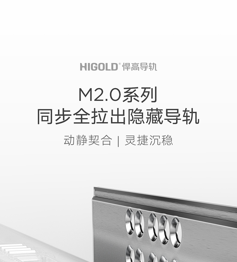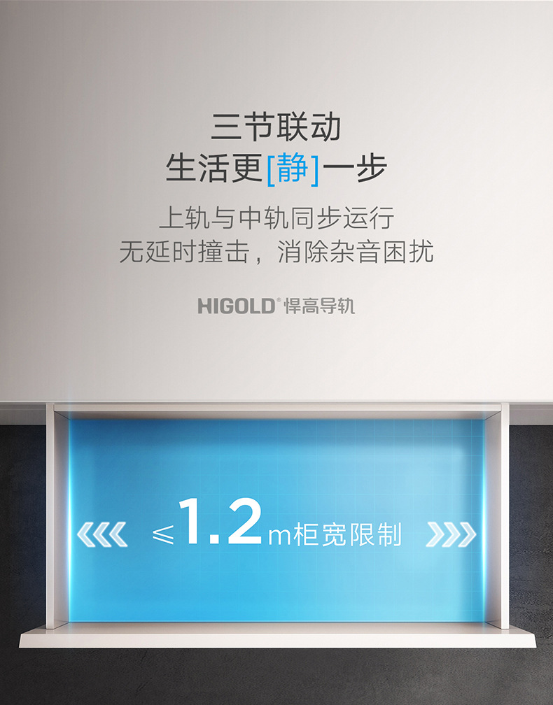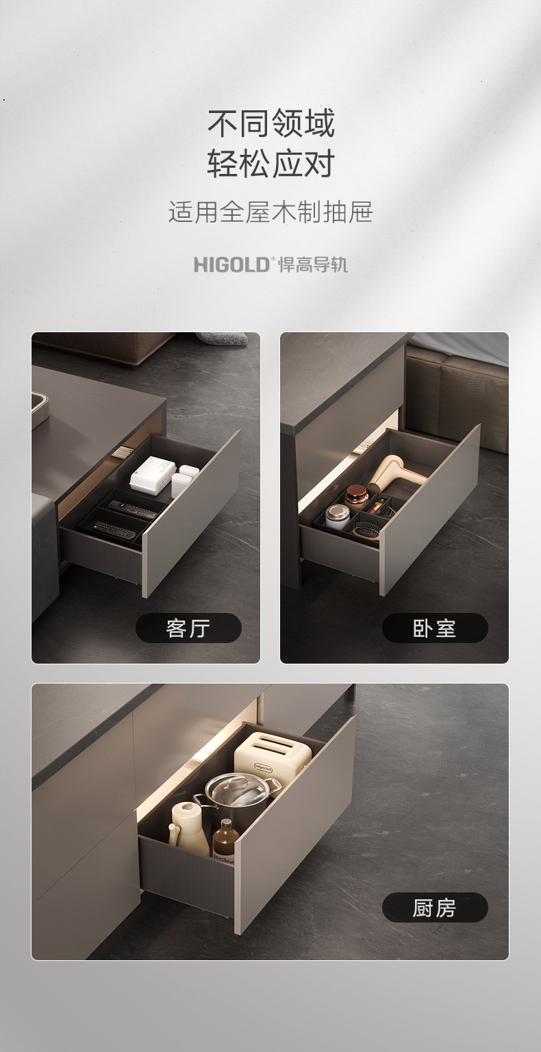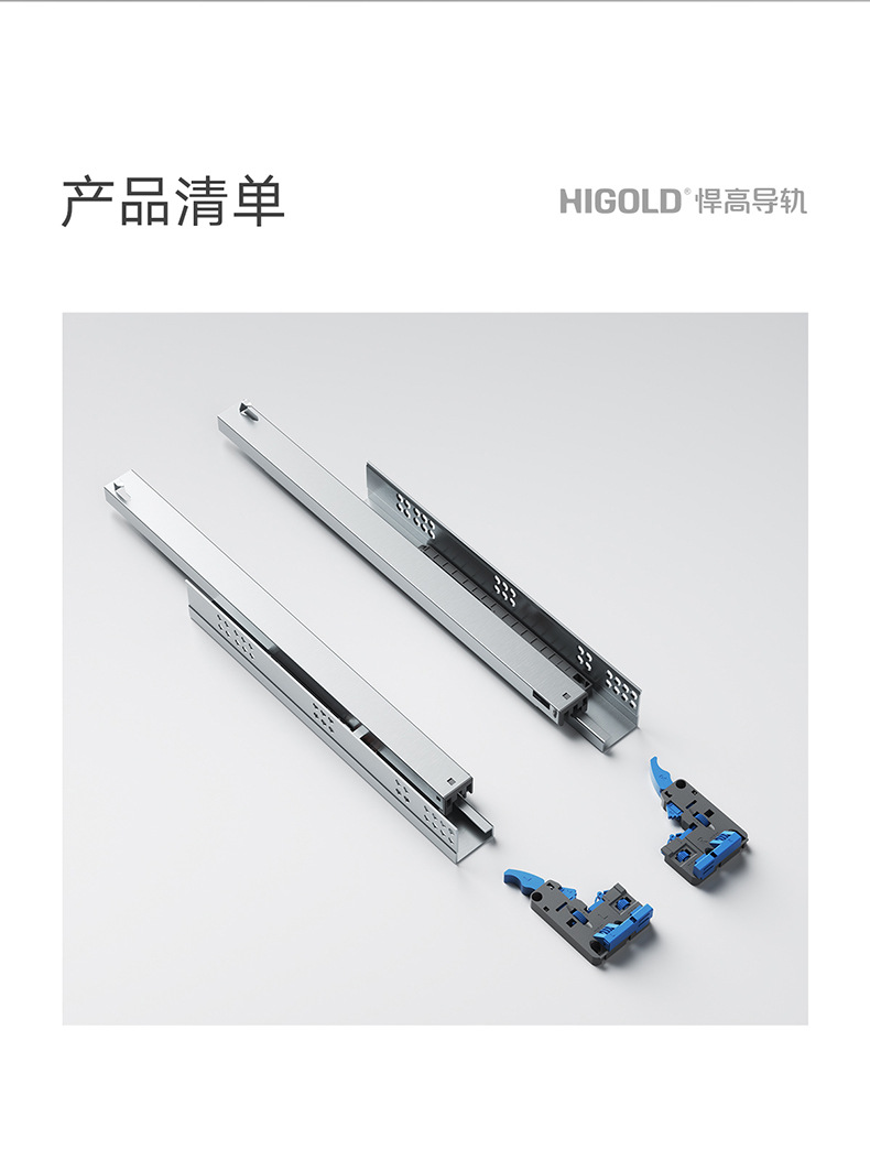 HIGOLD/悍高M系列隐藏全拉三节托底轨抽屉缓冲静音滑轨托底抽