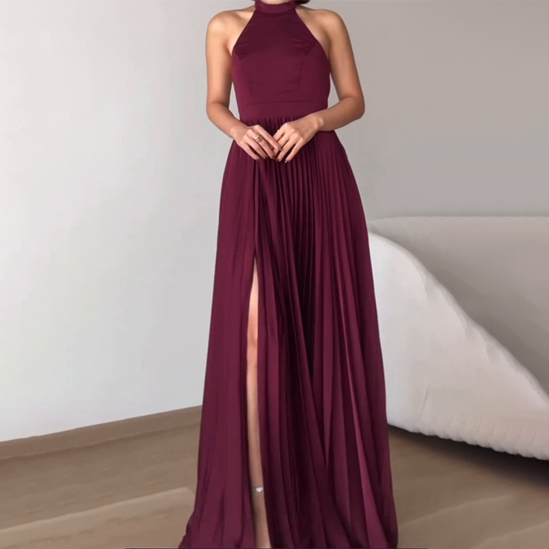 2025春の欧米のアマゾンの越境貿易の新型の純色の露背は首の袖なしのオープンフォークのワンピースを掛けます。