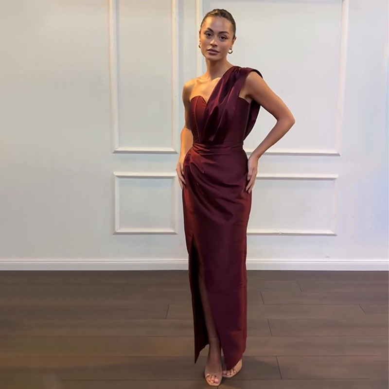 2025秋季欧美亚马逊跨境外贸新款纯色长袖斜领露背开叉包臀连衣裙