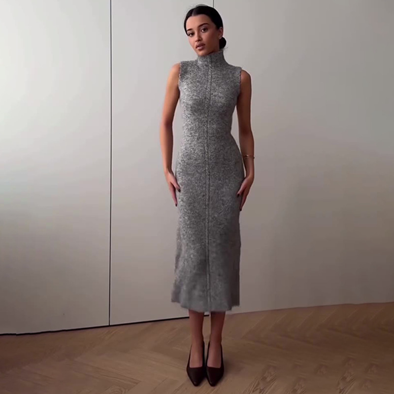 2025秋季欧美亚马逊跨境外贸新款纯色无袖高领毛衣包臀修身连衣裙