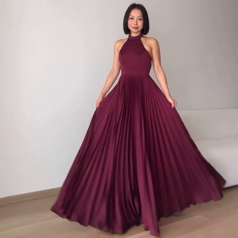 2025秋季欧美亚马逊跨境外贸新款纯色无袖斜领露背绑带气质连衣裙