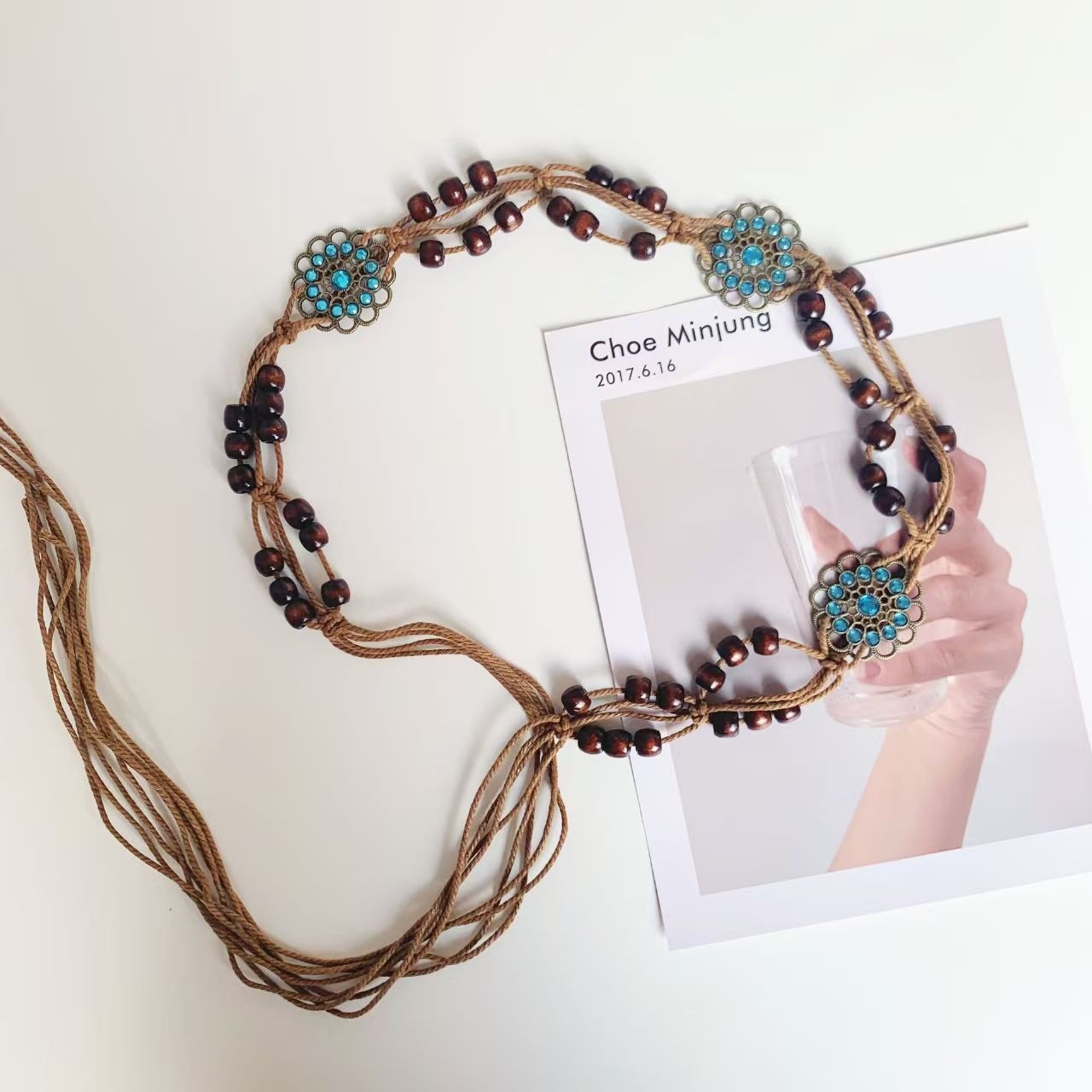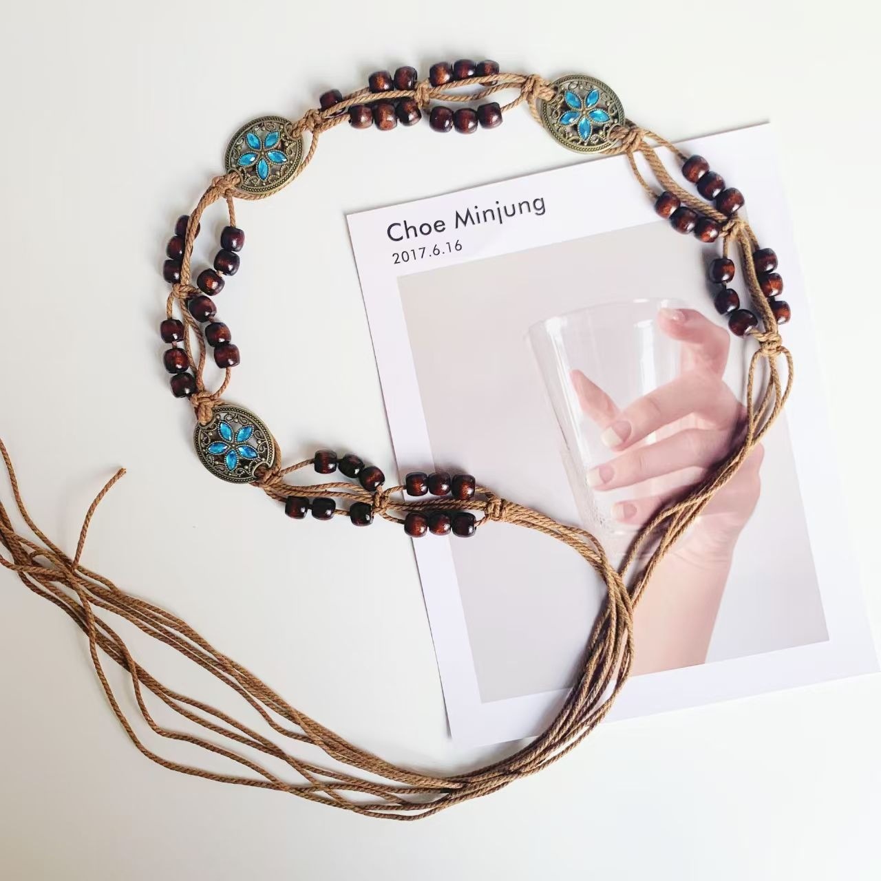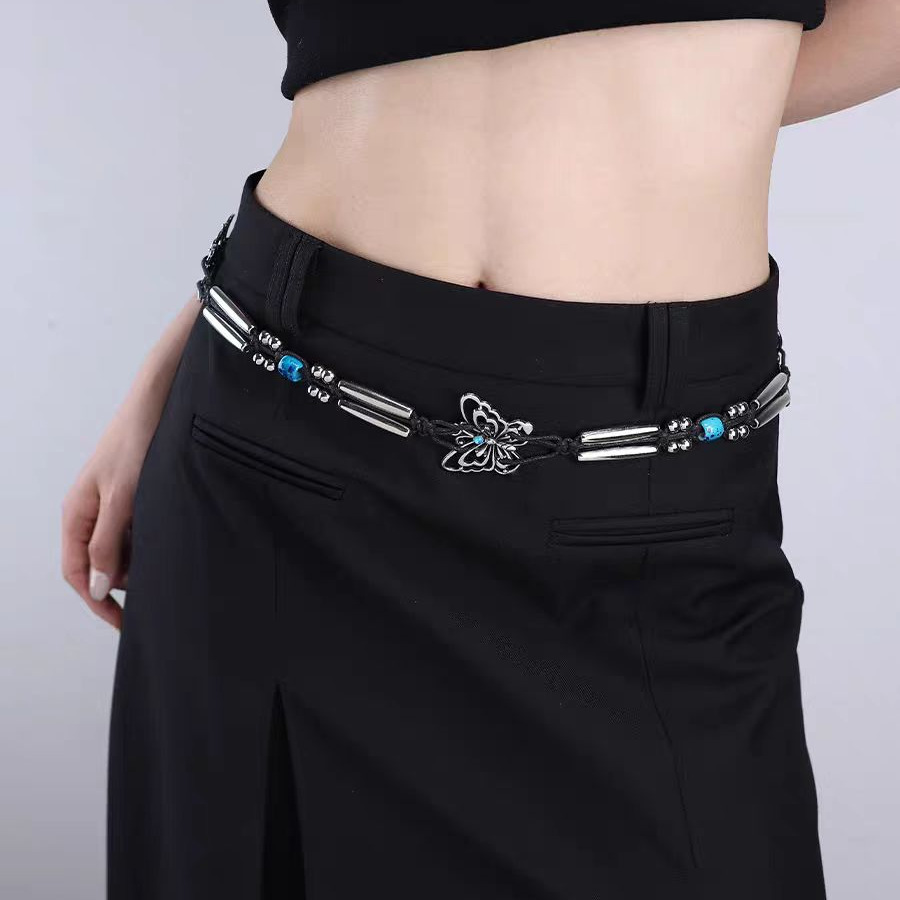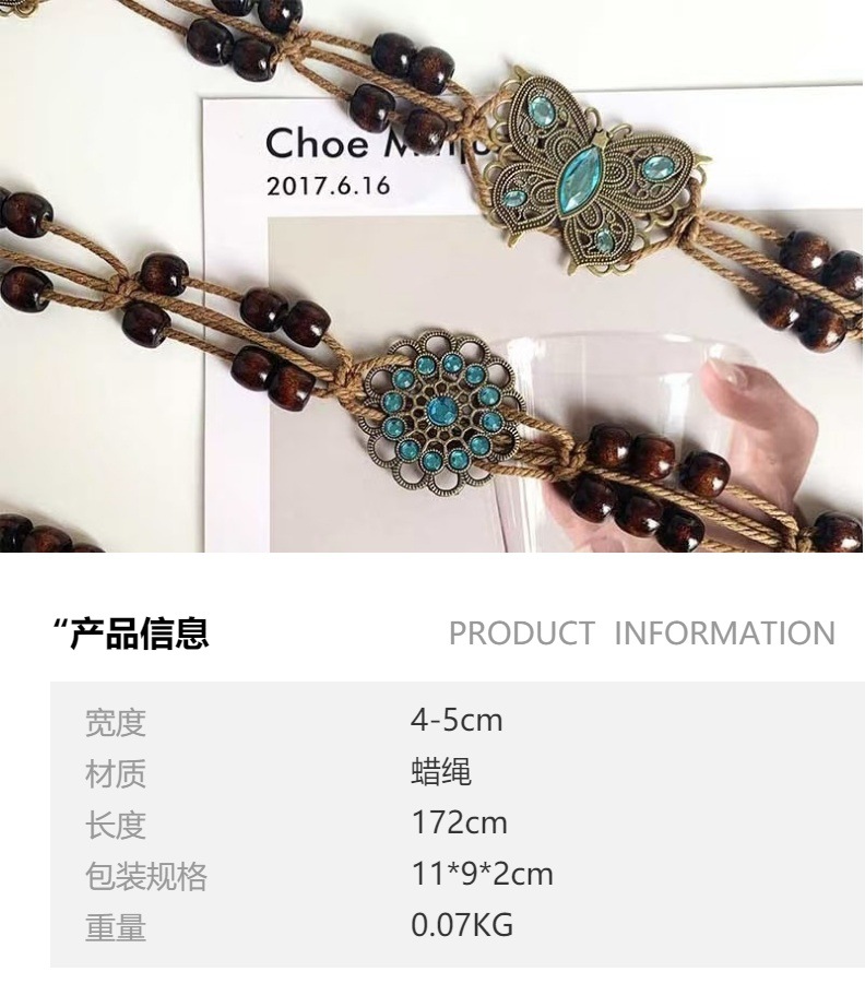 ボヘミアン風蝶水ドリル編み結び民族風手作り木製ビーズ女性ベルトカジュアルリゾート風ウエストロープ
