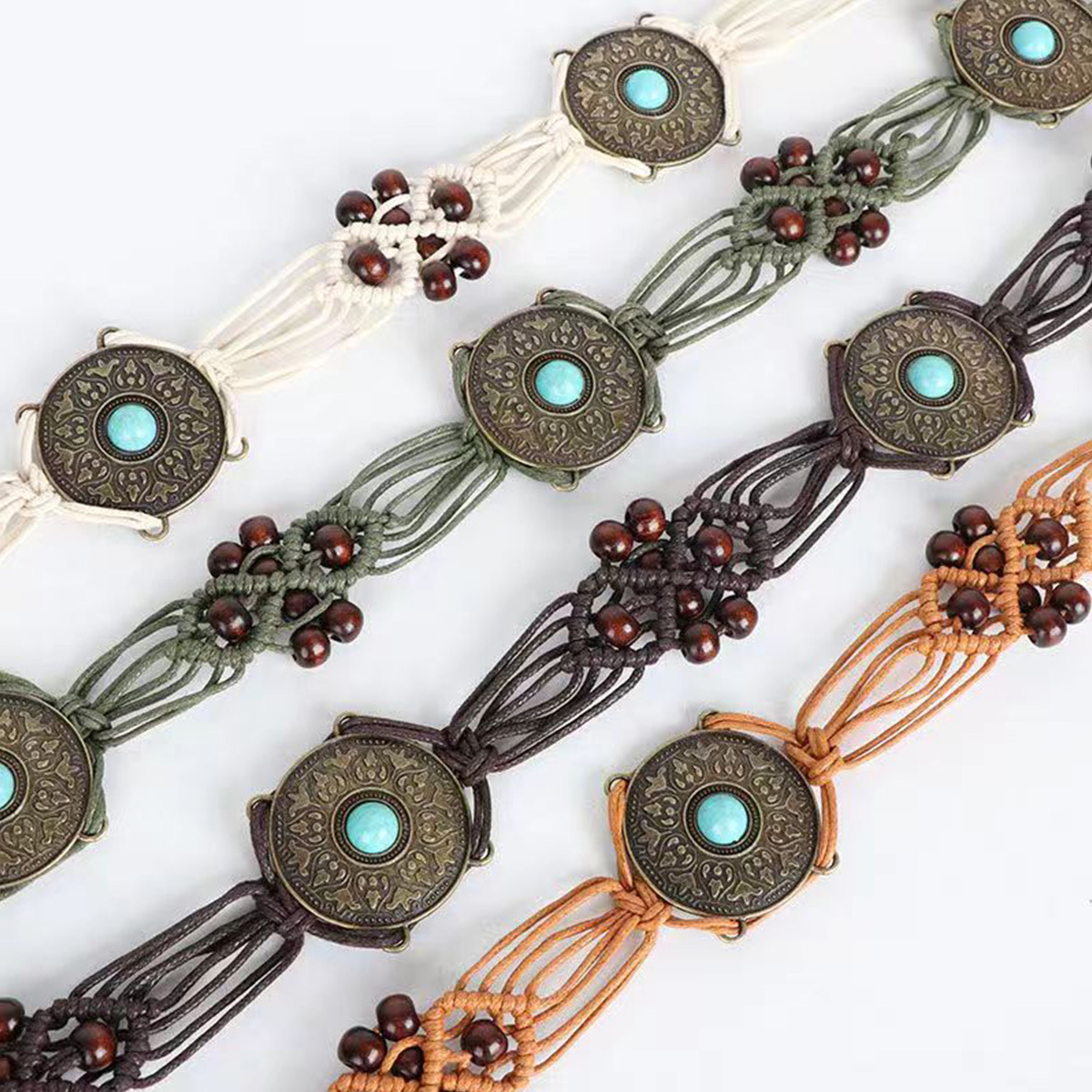 2024新型ボヘミアン風復古モザイク緑松石編み結び民族風女性ロープ