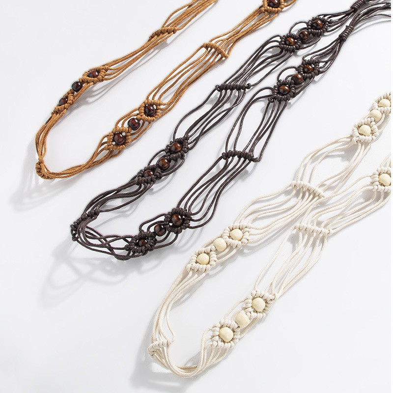 在庫あり レディース ボヘミアン レトロ エスニック風 編み込みベルト ブラウン木製ビーズ ワックスコード 手編み結び目付きウエストベルト