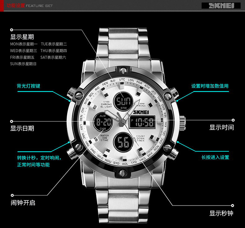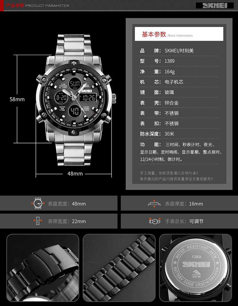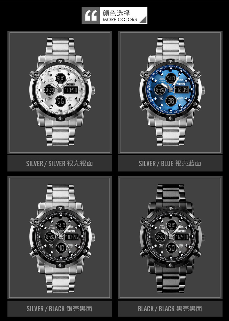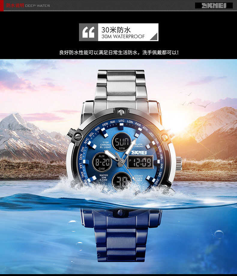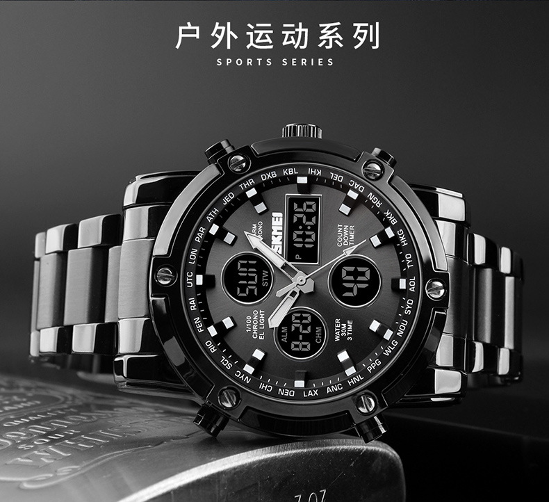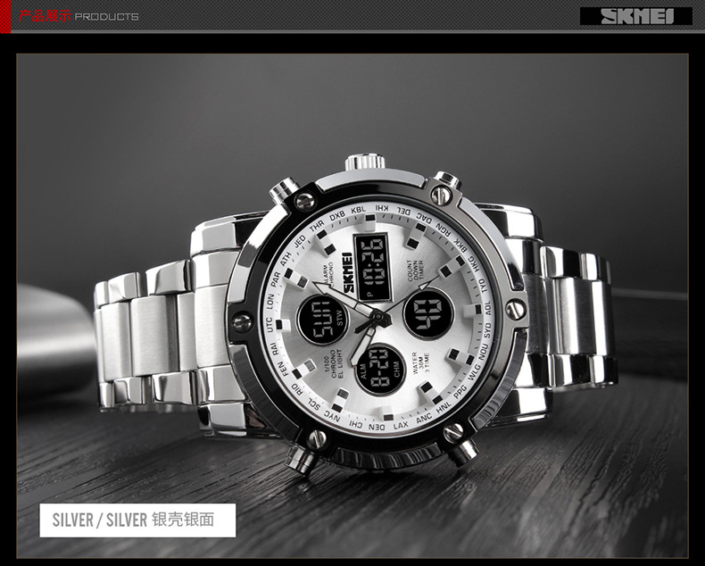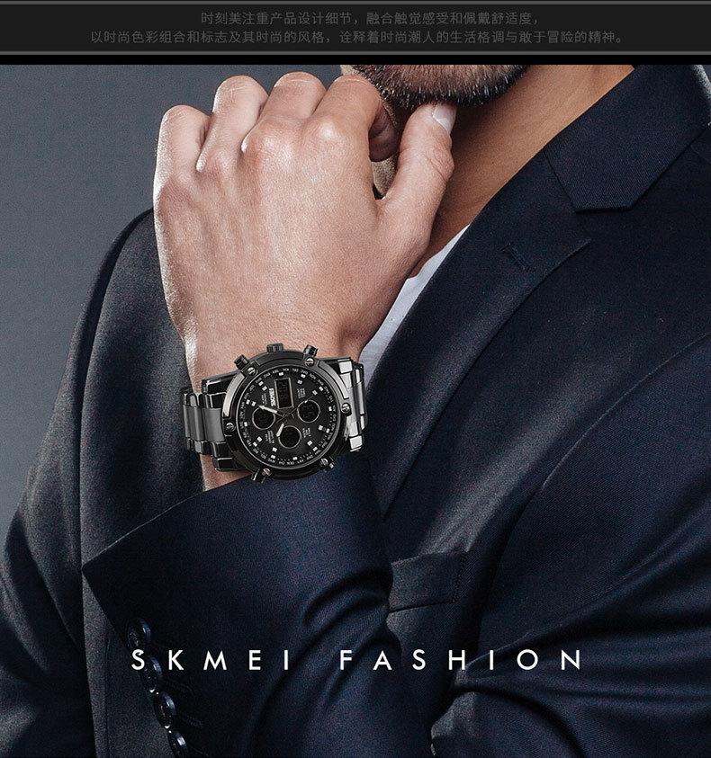 Skmei美メンズクォーツ時計ダブルディスプレイ電子時計多機能スチールベルト大文字盤三時間防水時計
