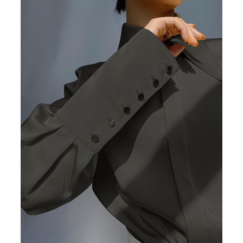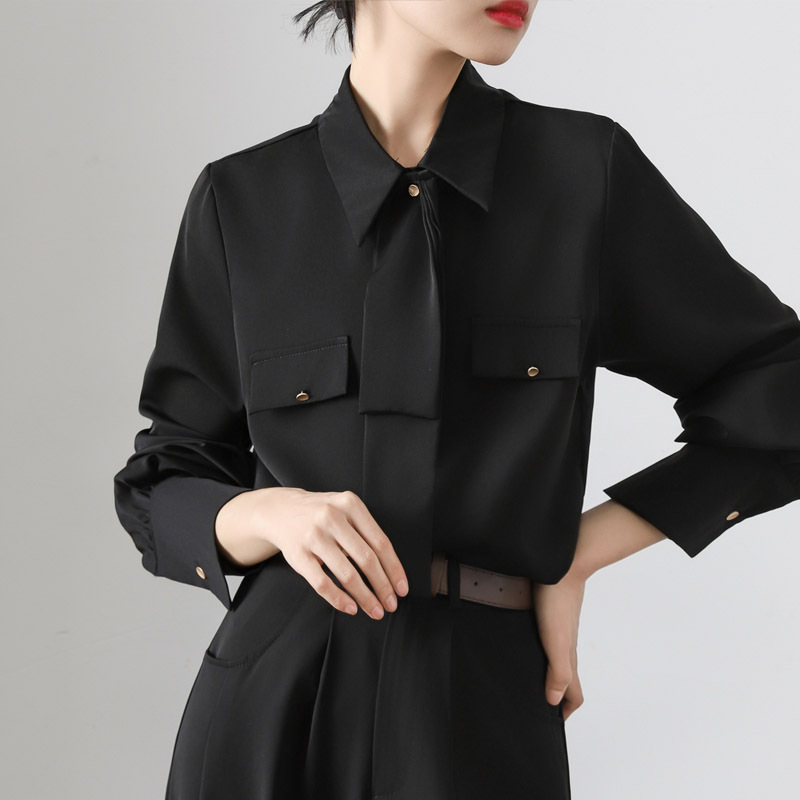 高級感のある洗練された黒いネクタイシャツ女性2025春の新しい気質通勤OL単列ボタン長袖シャツ