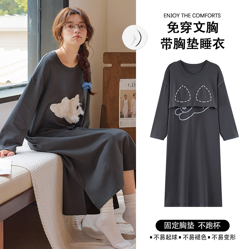 带胸垫长袖95棉拉架爽棉卡通少女睡裙女韩版甜美睡衣连衣裙可外穿