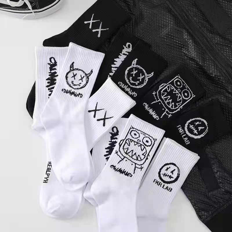 欧米ins韓国版鬼顔潮靴下中筒靴下ヒップホップホップカップル男女靴下腰花果工場ブランド白黒